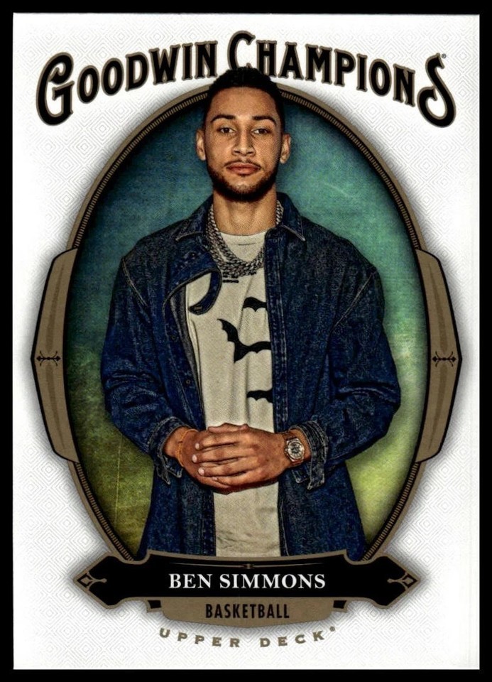 The 2020 Upper Deck Goodwin Champions Ben Simmons #20 trading card is a collectible item featuring the popular basketball player. This card is part of a larger set and is not considered vintage, making it a newer addition to any sports card collection. Perfect for fans and collectors alike, this card showcases Simmons in a dynamic and eye-catching design that is sure to be a standout piece in any collection.
