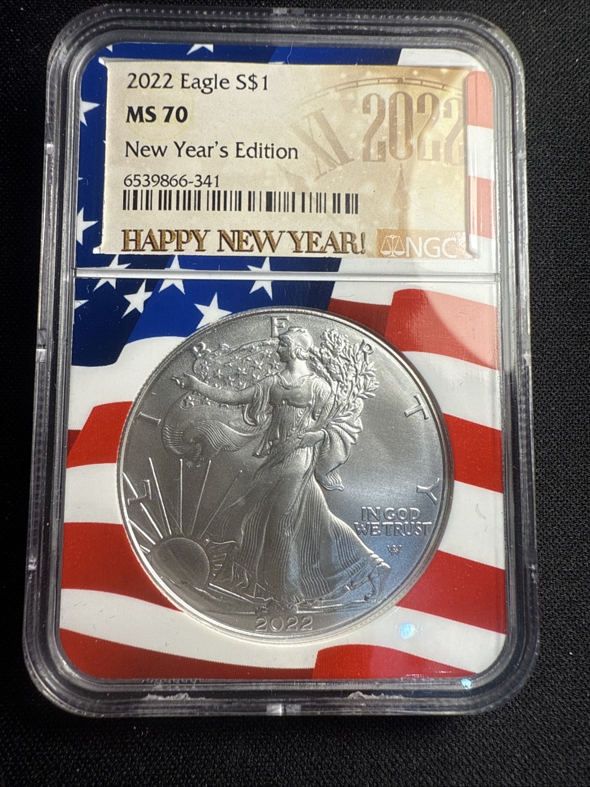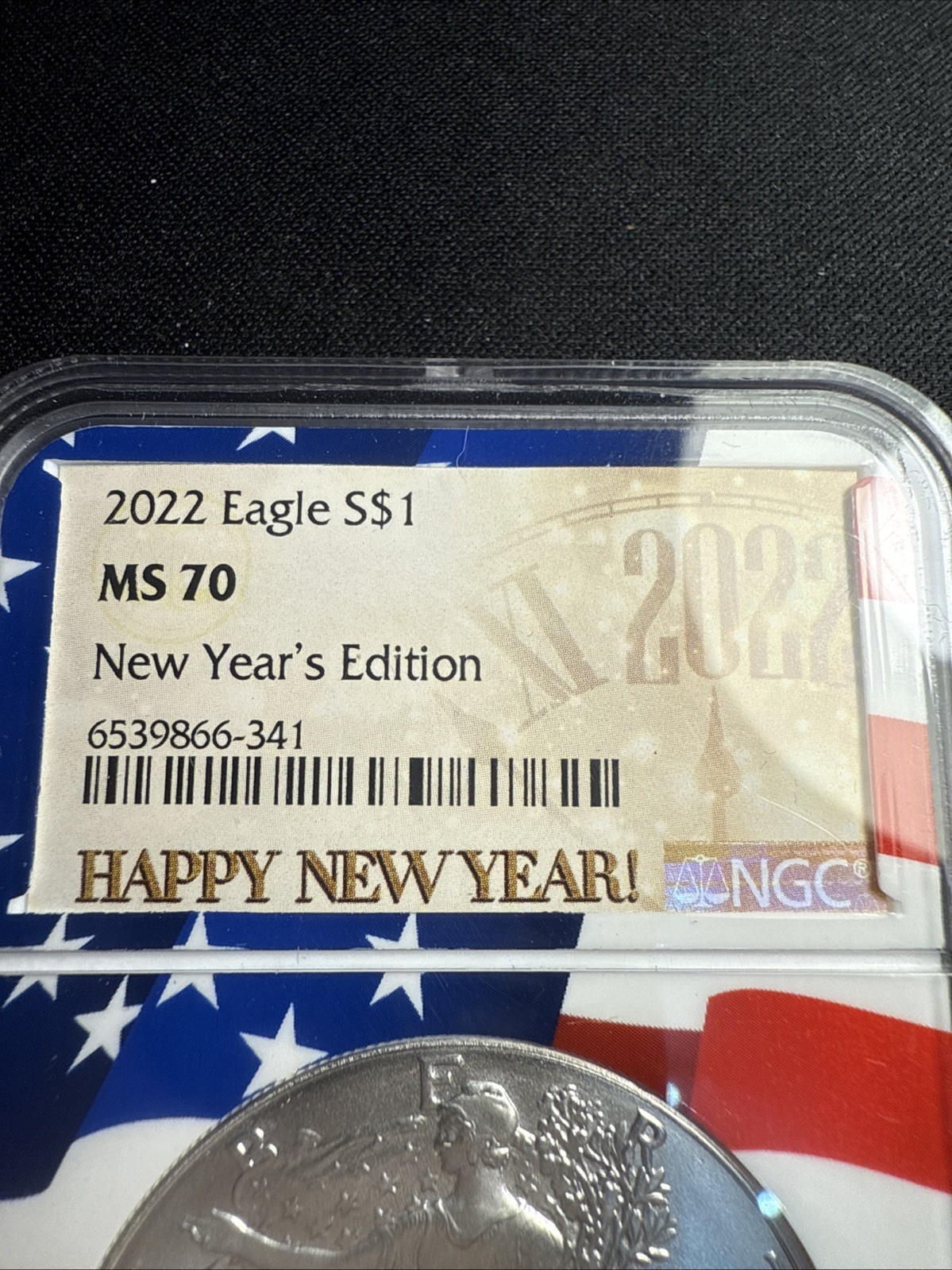 - 2022 $1 Silver Eagle NGC MS70 New Year's Limited Edition US Flag Holder Spotless