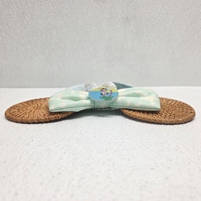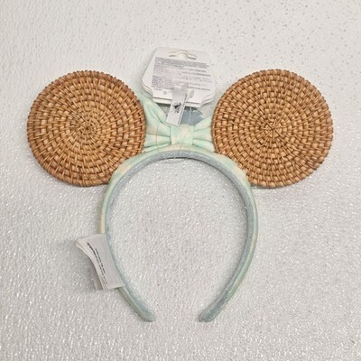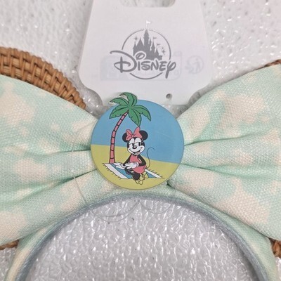 2024 Disney Parks Minnie Mouse Summer Tropical Palm Tree Rattan Headband Ears. Small spot on band and small scuff on front, see images for condition. Images show actual item that will ship.