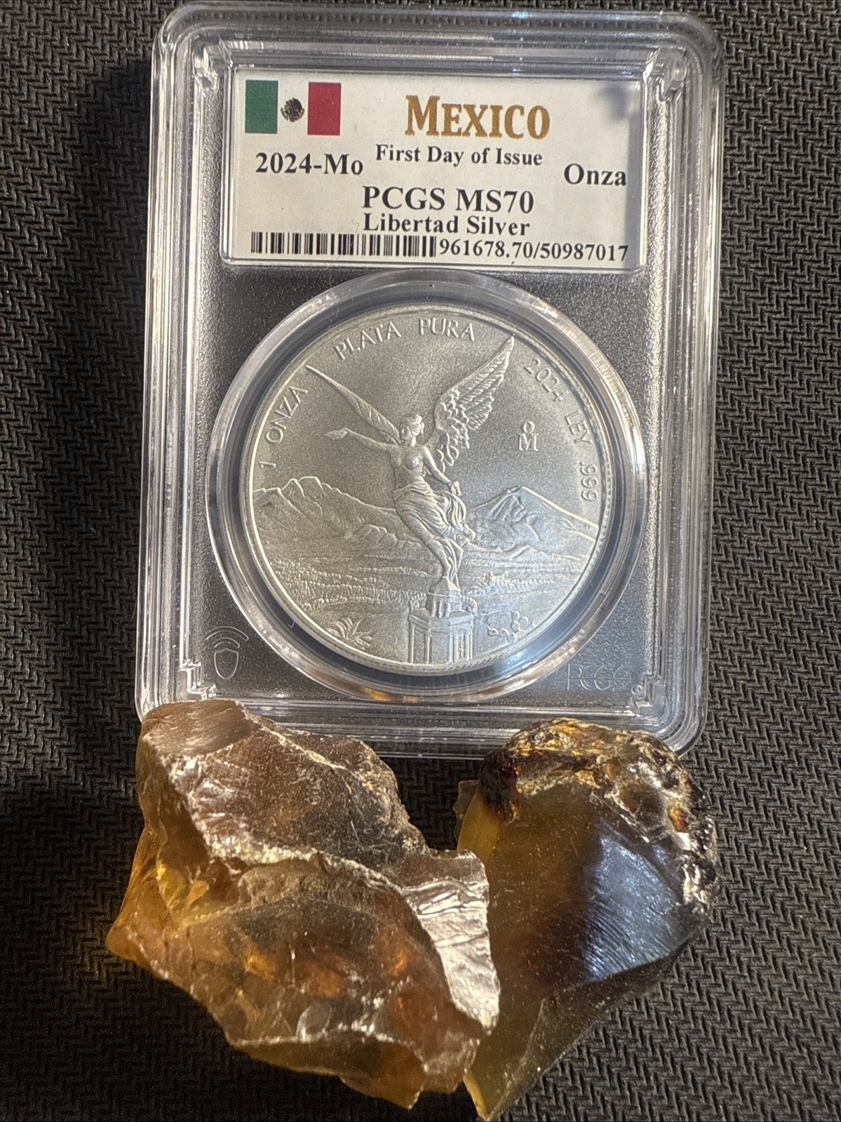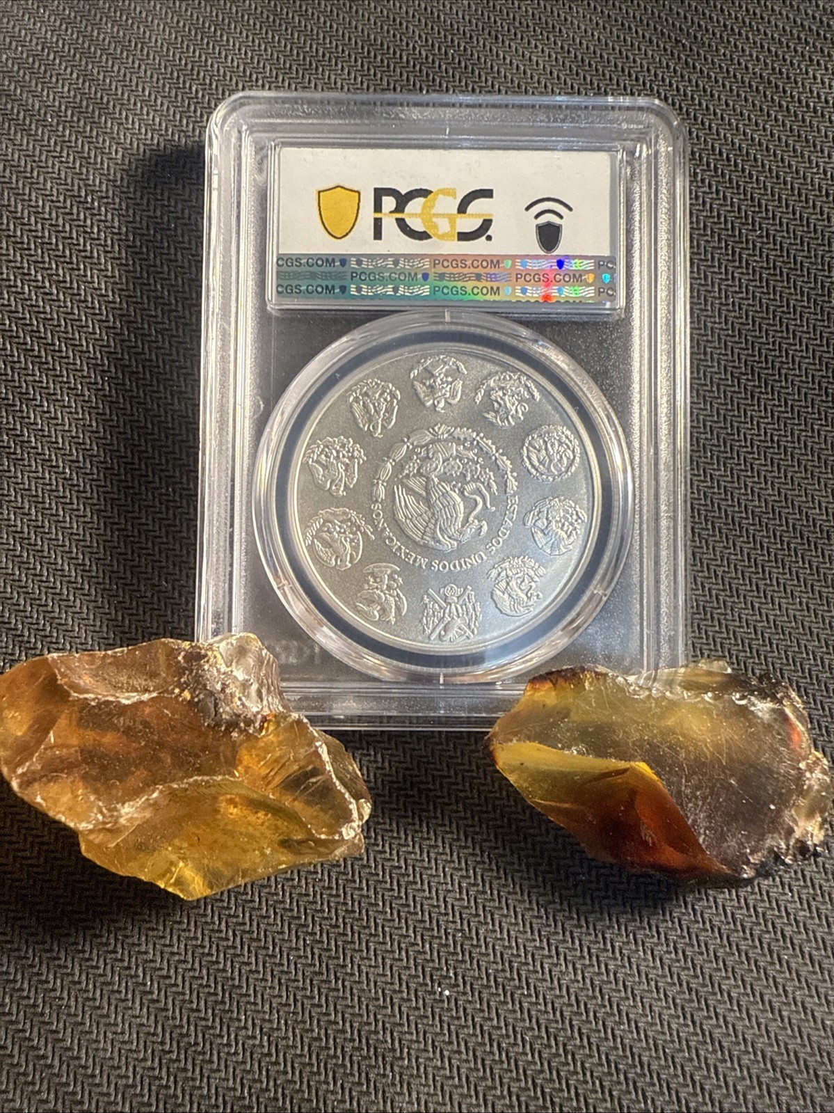 2024 Mexico 1oz Silver Libertad PCGS MS70 - And 2 Pieces Of Genuine Baltic Amber