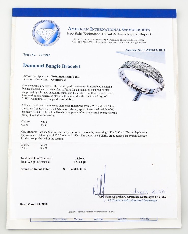 21.30 Karat Diamant Unsichtbar Set Armreif 18k Weiss Gold Armband 18.4cm