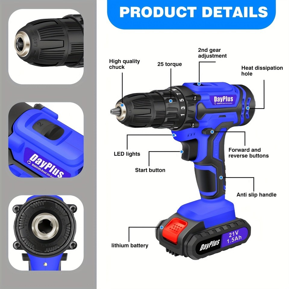 21V Cordless Drill ? Delivers strong torque for efficient drilling and fastening