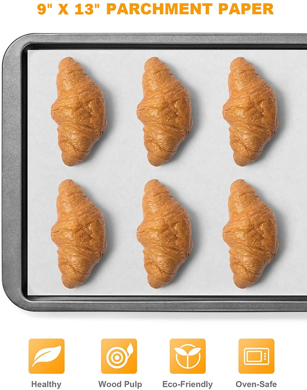 PRE-CUT PARCHMENT PAPER SHEETS: 220 pcs 9 x 13 pre-cut parchment paper for baking. It saves you from the hassle of the cutting step of cooking. You take out a piece of parchments paper and spread it on the baking tray, making your baking process convenient and effectively avoiding measuring and cutting from a curled parchment roll. NON-STICK EASY TO CLEAN: Still worrying about the finishing work after baking? Our cooking parchment paper is waterproof greaseproof, Food can be easily slid off from the baking tray, and you need to remove the paper and throw it away after baking. Heavy-duty parchment paper sheets for baking will reduce the trouble and time of cleaning the baking tray after cooking. Let you enjoy the fun of baking. NATURAL, UNBLEACHED HEALTHY MATERIAL: Baklicious natural parchment paper sheets are certified Food safe, made from natural wood pulp and fluorescent free, food-grade, unbleached, NON-TOXIC, and BPA-free. HEAVY-DUTY BAKING PAPER: 45gsm thickness; it's thick enough to pick up cooked loaf of bread without disintegrating. Compared to the 35gsm paper, ours is stronger, more durable, and less brittle. It's about 15% thicker than others. So you can easily pick up the food on the baking sheet by lifting baking sheets of parchment paper without breaking. MULTIPLE-PURPOSE: Our parchment paper for baking is suitable for baking, cooking, grilling, steaming, and storing food. Cooking bacon, roast potatoes, and vegetables, baking cookies and bread, parceling food, make biscuits and pizza, wrap fish, etc. There will be no scorching and liquid penetration of the pre-cut parchment baking paper sheets. Pre-cut baking parchment sheets is a very frequently used and easy-to-use item in the kitchen