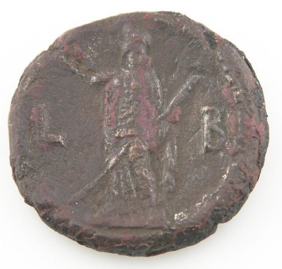 L'inverse represente Eirene (Pax) tenant la branche d'olivier et le sceptre, debout a gauche, avec "KG"Dans les champs (lb = annee 2)