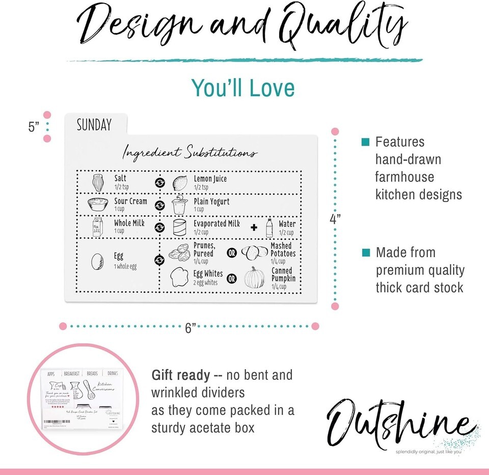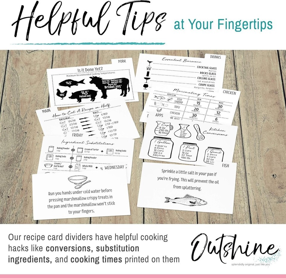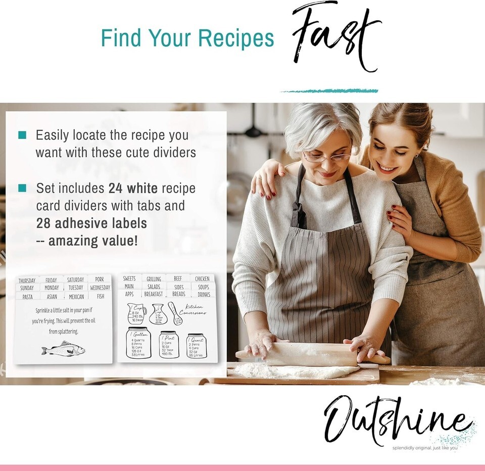 Time spent in the kitchen should be enjoyable, not chaotic! Our 24 Set Recipe Card Dividers not only help you locate your favorite recipes at a glance, but they also bring style and personalization to your cooking journey. Whether gifting to a loved one or treating yourself, these dividers transform recipe management into a fun and organized experience.