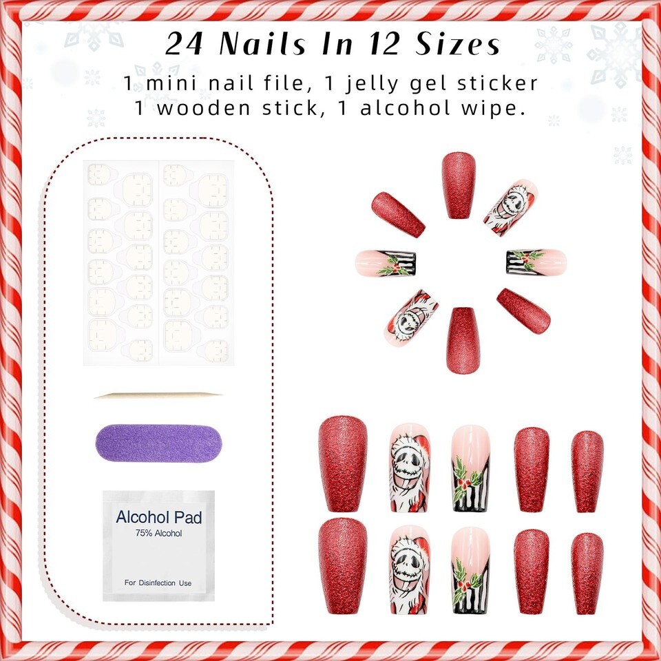 Set Includes: 24 pieces of full cover fake nails in 12 different sizes, 2 mini nail files, and 1 sheet of jelly gel stickers, providing you with an all-around nail art experience.