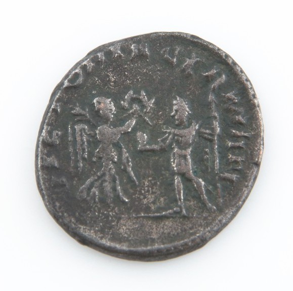 Le revers montre la victoire (debout a droite) tenant la paume et presentant une couronne a Gallienus (debout a gauche) tenant du globe et de la lance