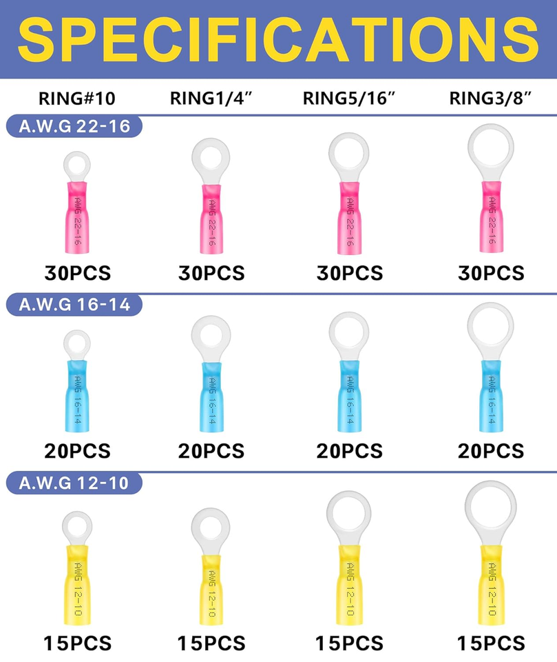 The kit includes 3 wire gauge ranges (22-16 AWG red, 16-14 AWG blue, 12-10 AWG yellow) and 4 ring sizes (#10, 1/4", 5/16", 3/8"), covering a wide variety of applications. Each terminal features 1/3 heat shrink tubing for a secure, waterproof seal that resists moisture, dust, vibration, and corrosion.