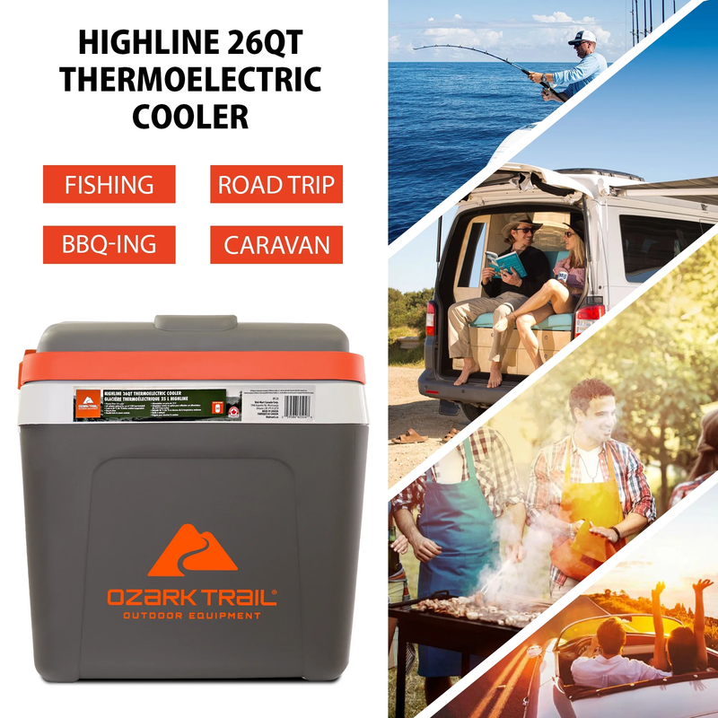 Packing for day trips is easy with the Ozark Trail Highline 12V Iceless 30 Can Electric Cooler, Portable Travel Thermoelectric car mini cooler. With its 24L (26 Quart) capacity and compact footprint, the Ozark Trail Highline Electric mini Cooler is the perfect cooler for day trippers, picnickers, and festival-goers. Designed for portability, this grey electric Cooler hard-sided cooler fits up to 30 standard 12 oz cans and does not require ice for cooling. Ozark Trail electric mini Cooler features a durable handle that locks into place to secure the lid and a convenient built-in cord storage compartment. Advanced thermoelectric technology keeps contents cool to 40F (22C) below room temperature using less power than your vehicle?s tail light. You can easily keep your favorite drinks cold or safely transport perishable items like yogurt, cheese, milk, and meats. With the optional AC adaptor (sold separately) you can seamlessly transition indoors. With industry-leading technology and insulation, the Ozark Trail Highline cooler outperforms leading name-brand competitors in ice-retention tests, keeping ice frozen for THREE FULL DAYS when used as an unpowered ice chest.