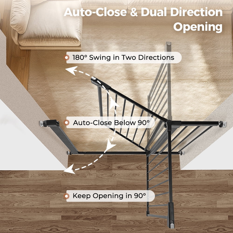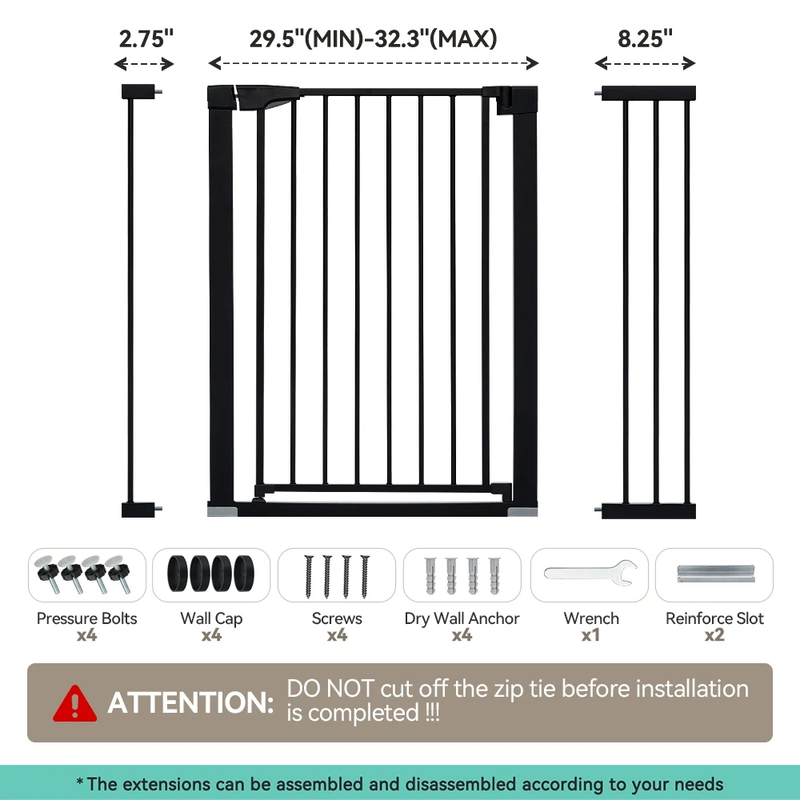 Fits openings 29.5-43.3 inches Wide. Stand 30 inches tall. Ideal for doorways, hallways, the bottom of stairs, kitchens, laundry rooms, bedrooms, and playrooms. Notice: Must measure your openings before purchasing this extra wide gate. Upgraded Double-lock system, press two buttons to open the dog gate. No lift, no effort. No worries about forgetting to lock the dog fence, it will close automatically, easy one-hand operation. The large 23.6 in walk-thru gate makes it easier to walk. Heavy duty steel frame pet gate can defend against up to 100-pound impacts by your pets. Never worry your pets jump over the gate. Simple pressure-mounted installation requires no tools drilling. Friendly Warning: If using the baby gate at top of the stairs, hardware-mounted installation is mandatory. 1 x Main Gate with Door 3 x Extension Panels (2x2.75" 1x5.5") 4 x Tension Bolts 4 x Wall Cups 1 x Wrench 4 x Screw Large Extra Wide Extra Safety Auto Close Gate Durable Construction Easy to Install Color: White/Black Material: Steel, PP Fits Openings: 29.5"-43.3" Wide Height: 30" Walk-through Width: 23.6" Pressure Mounted Installation: Yes Hardware Mounted Installation: Yes (hardware included) Upgraded Double Lock: Yes Shipping Weight: 14.8lbs