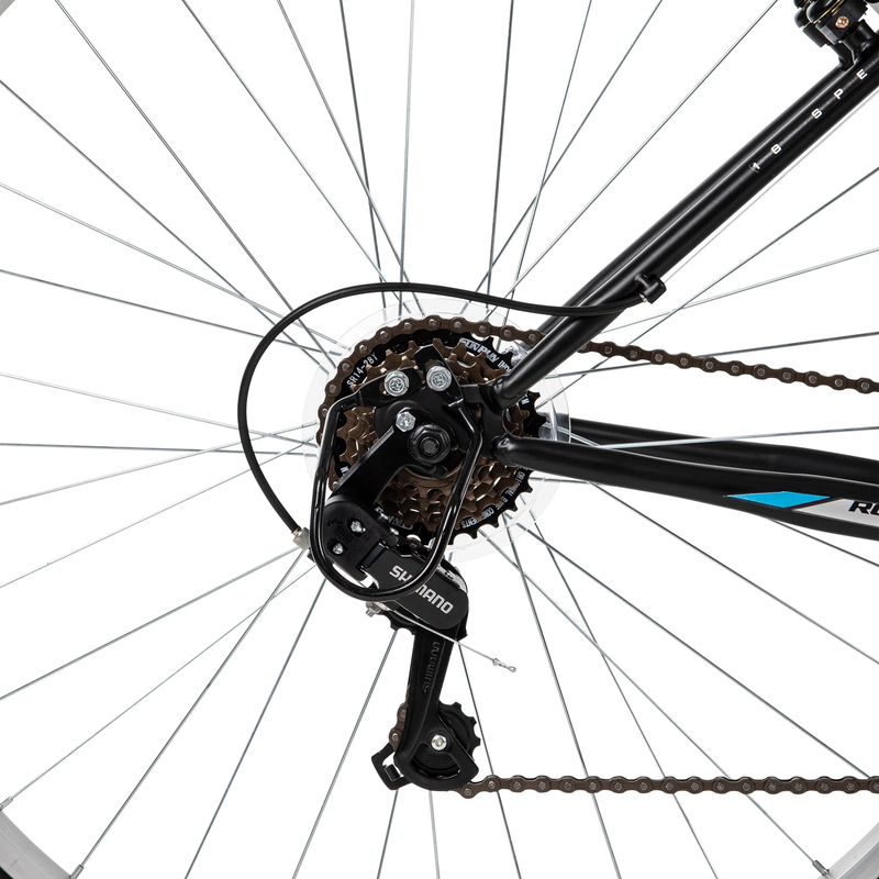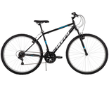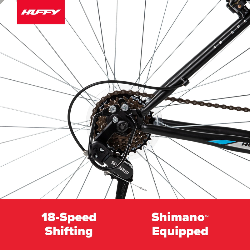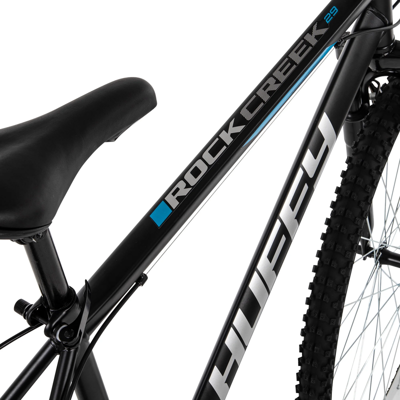 The Huffy Rock Creek 29-inch Mountain Bike in black with teal accents combines a hardtail frame, great style and the right specs to have a blast over bumps on paved trails or rides around the neighborhood. Smooth 18-speed index shifting system with a Shimano rear indexed derailleur consistently shifts between gears for quick adjustments venturing uphill or accelerating on level ground.