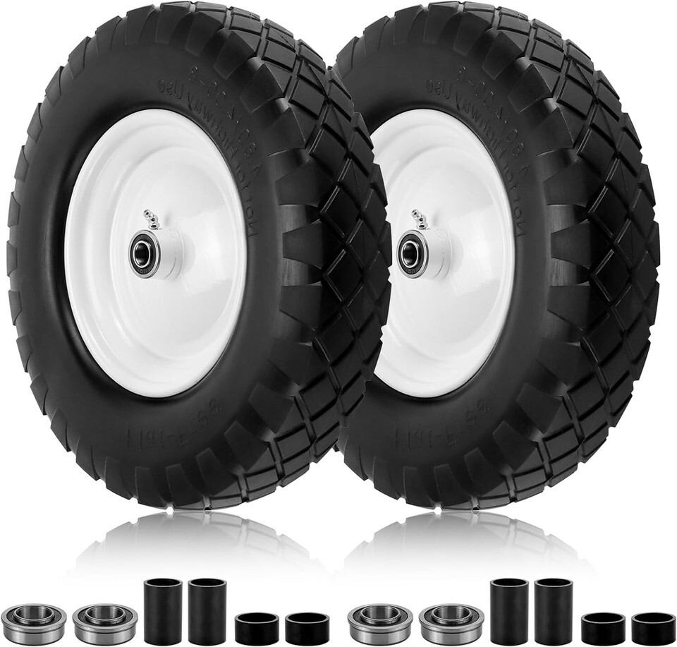SPECIFIC SIZE: [2-pack] 4.80/4.00-8 tire and wheel replacement 16" Heavy Duty Solid Flat-Free Replacement Wheels with Diameter: 16" Tire Width 3"; Axle Bore Diameter: 5/8"; hub offset: 3". Additional extension spacers and 3/4" bearings make our 4.80/4.00-8 tire suitable for almost all flat free wheelbarrow tires with hub lengths between 3" and 7".Please check the size before you buy it To make sure the tires match?