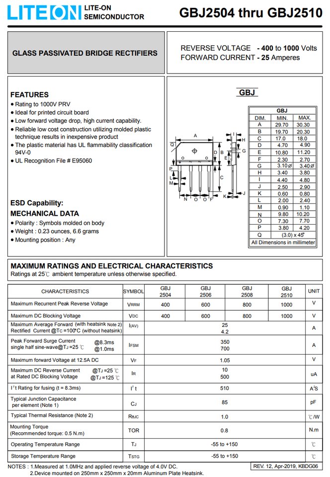 - 2X GBJ2508-F GBJ2508 LITE-ON Bridge Rectifier 1-Ph 800V 25A GBJ 4-Pin 2Pcs