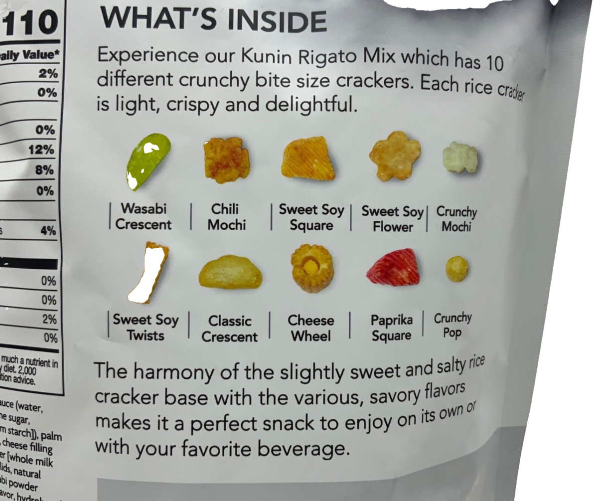 Experience our Kunin Rigato Mix which has 10 different crunchy bite size crackers. Each rice cracker is light, crispy and delightful.