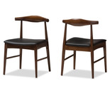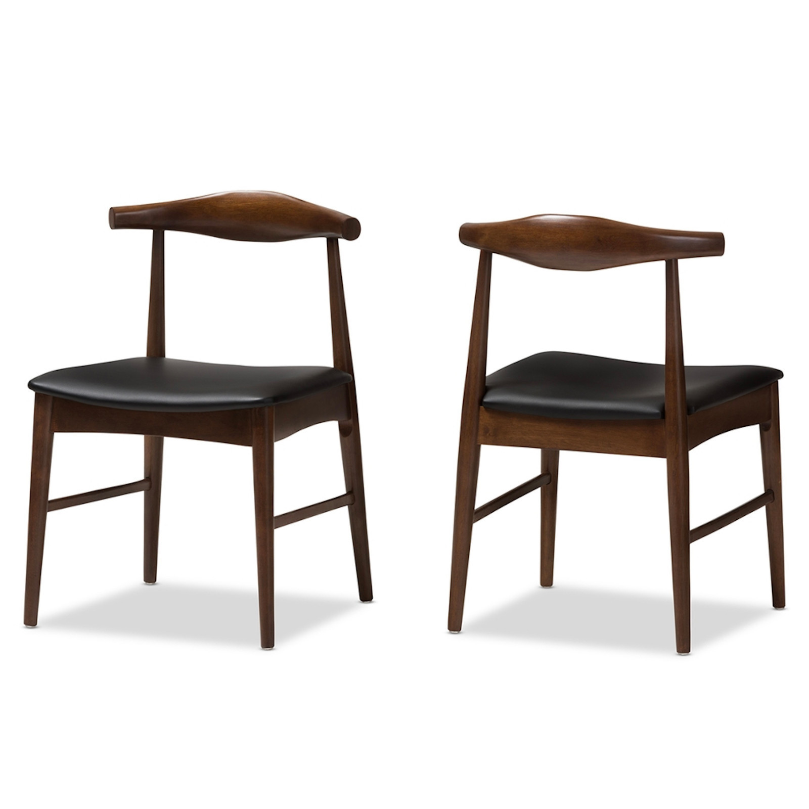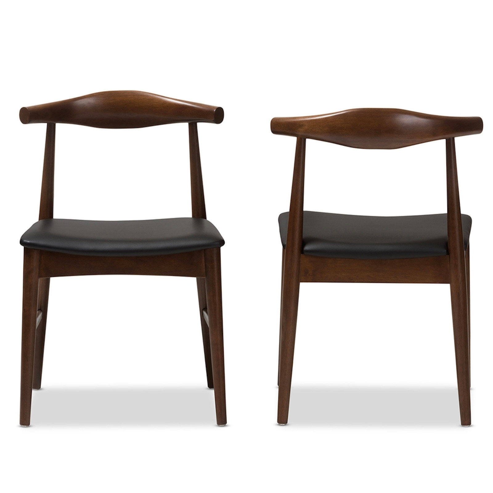 Each chair has a sturdy, solid wood frame including a gently curved back with an attractive medium walnut-like wood stain resembling walnut. The comfortable seat is padded with dense foam and finished off with soft faux leather in black.