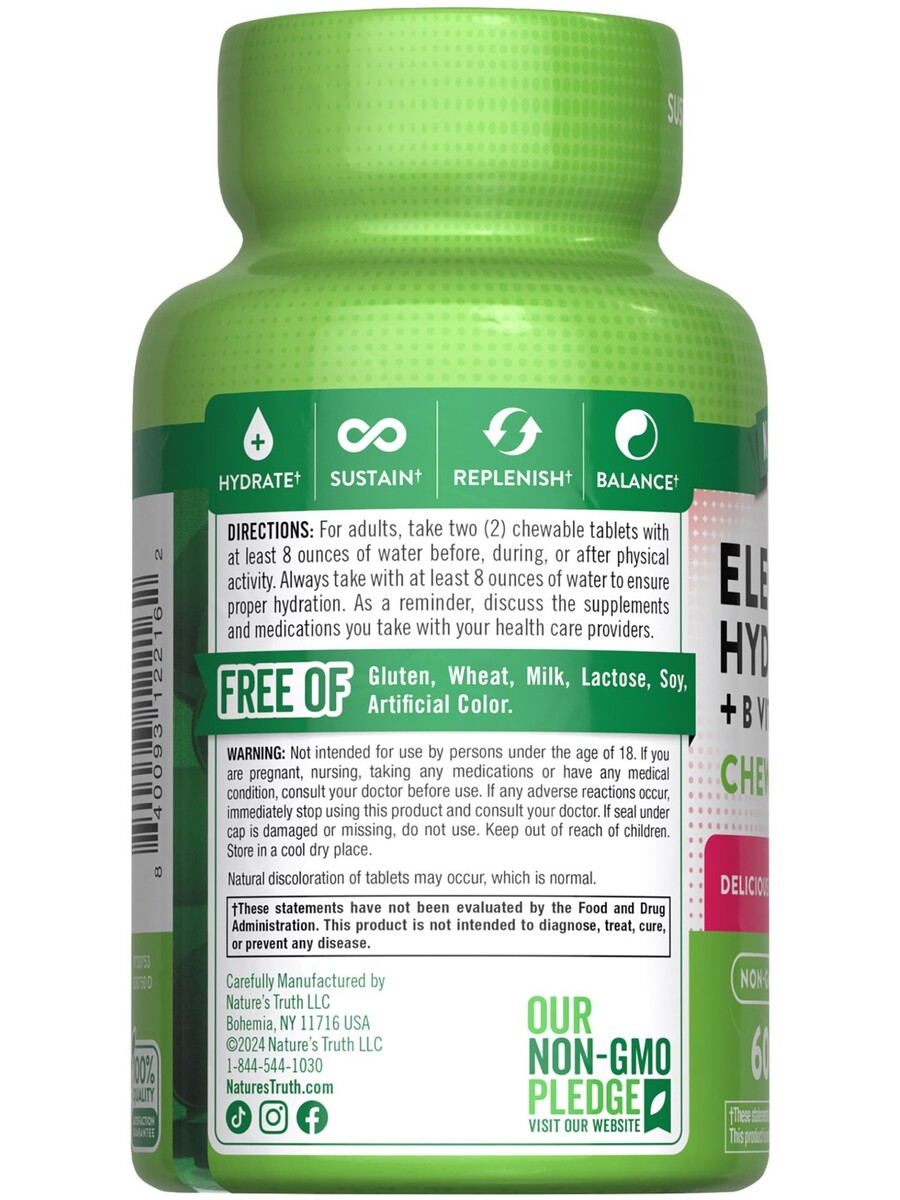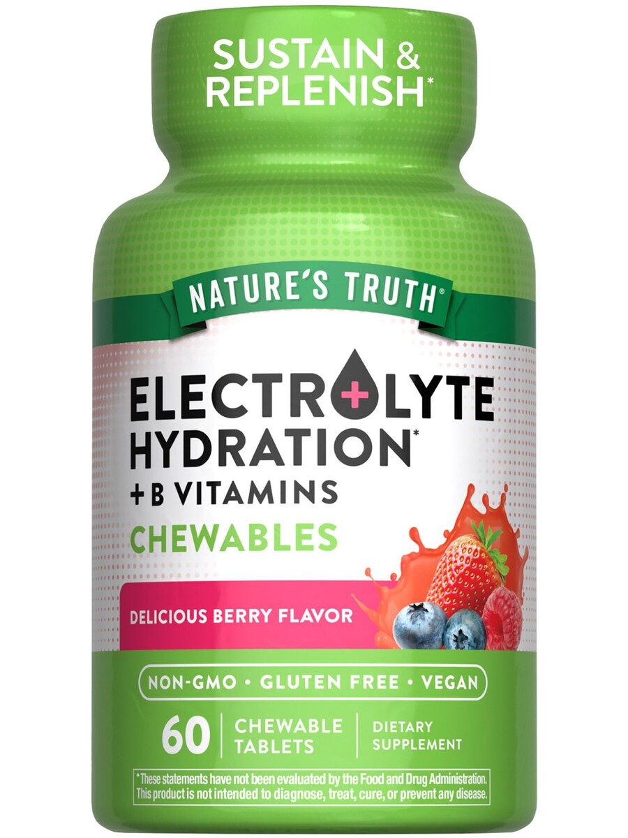 2 Pack Expiration Date of 04/2026 ? DAILY HYDRATION: A great way to receive key electrolytes, minerals, and B Vitamins each day ? VEGAN CHEWABLE TABLETS: Delicious berry flavored tablets are suitable for all lifestyles ? HONEST TRANSPARENT: Nature?s Truth is committed to delivering the best quality wellness products ? EXPERTS YOU CAN TRUST: Backed by three generations of Vitamin Innovators for unrivaled quality ? NATURALLY FREE OF: Gluten, Wheat, Milk, Lactose, Soy Artificial Color, and Non-GMO