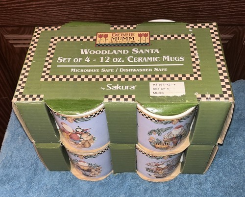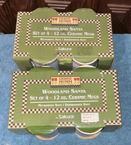 2x Set Of Debbie Mumm WOODLAND SANTA 4 - count 12oz SAKURA Ceramic Coffee Mugs in original boxes.