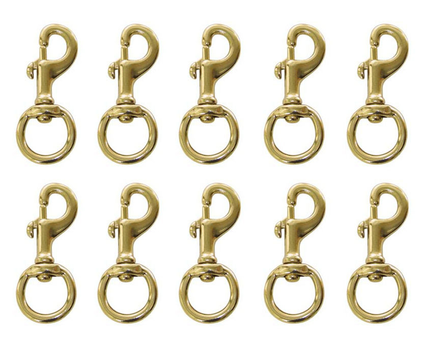 Lot of (10) brass plated swivel round eye heavy duty bolt snaps. Snaps measure 3/4" x 3-1/8".