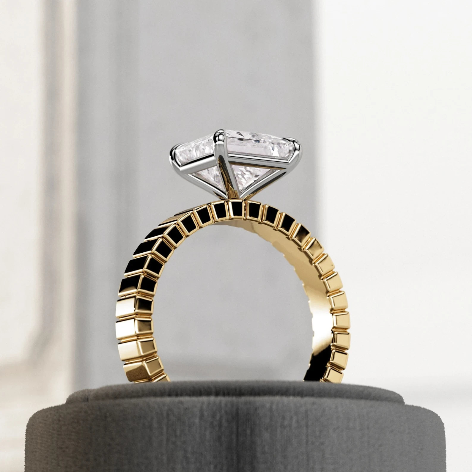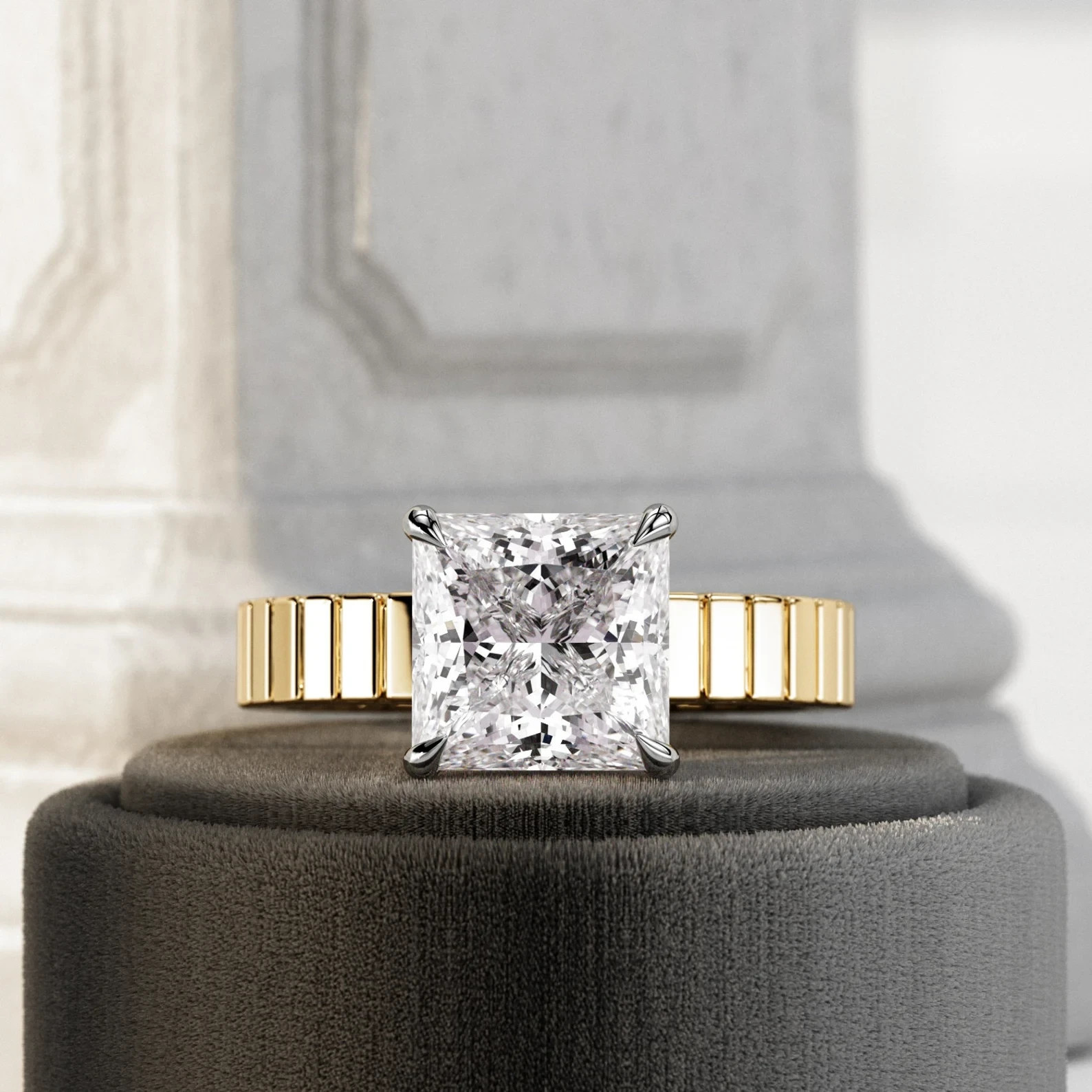 Command attention with this dazzling 3.50 Carat Princess Cut Lab Grown Diamond Engagement Ring, showcasing a bold and brilliant square silhouette with unmatched sparkle. The sharp angles and contemporary shape of the princess cut create a strikingly modern look, while the warm tones of 18k yellow gold bring timeless elegance and radiant warmth.