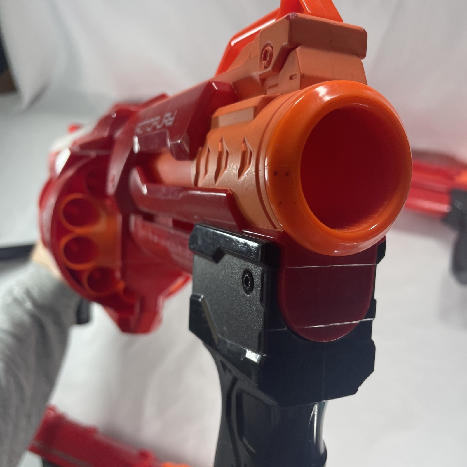 Unleash the action with this trio of NERF guns, featuring the Mega CycloneShock and RotoFury series models. Perfect for NERF battles, these guns are designed for enthusiasts aged 8 and up. They come pre-owned and ready to work, boasting the quality and excitement that the NERF brand is known for.