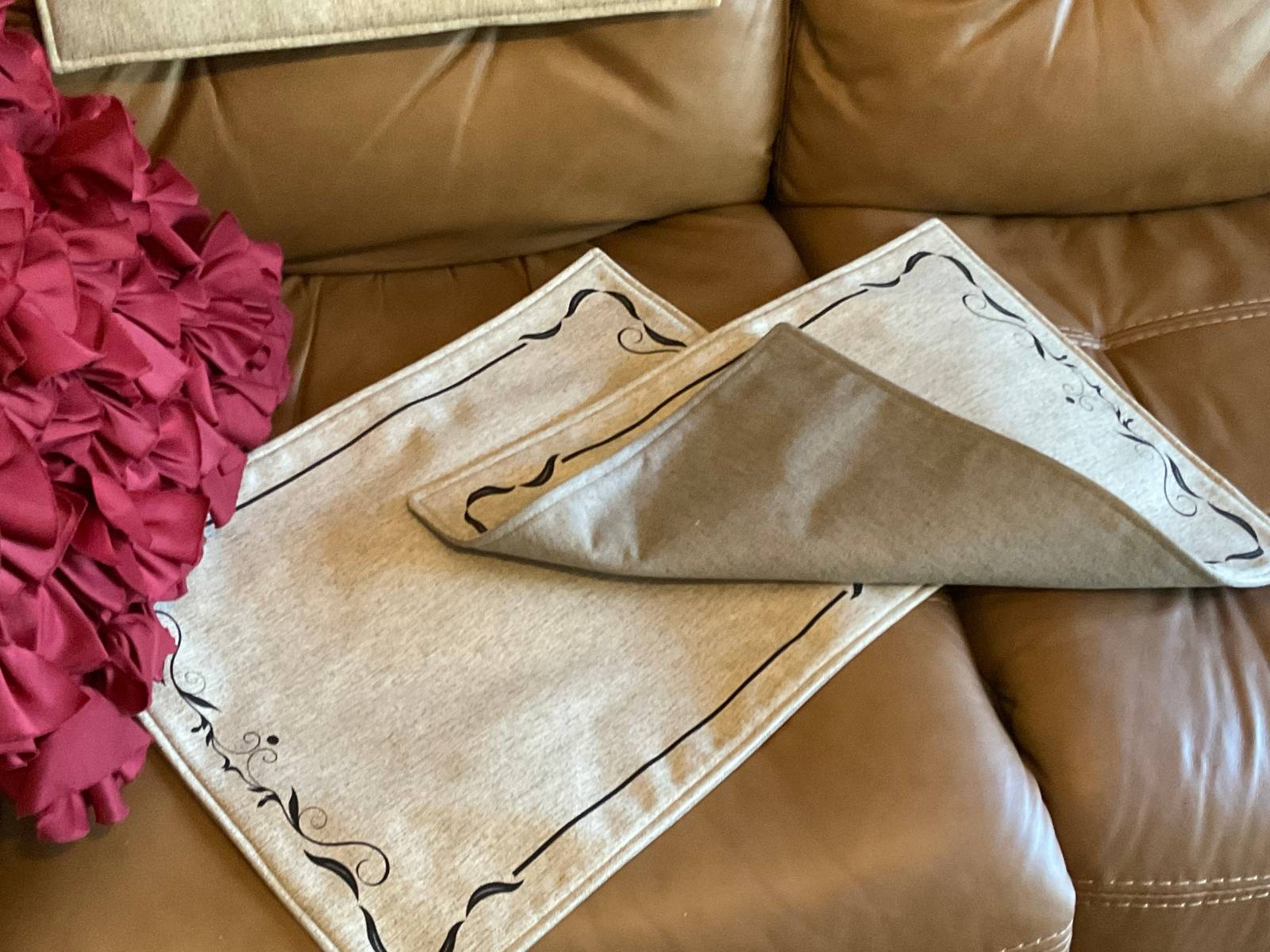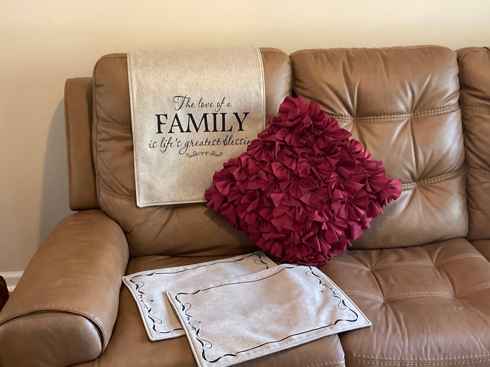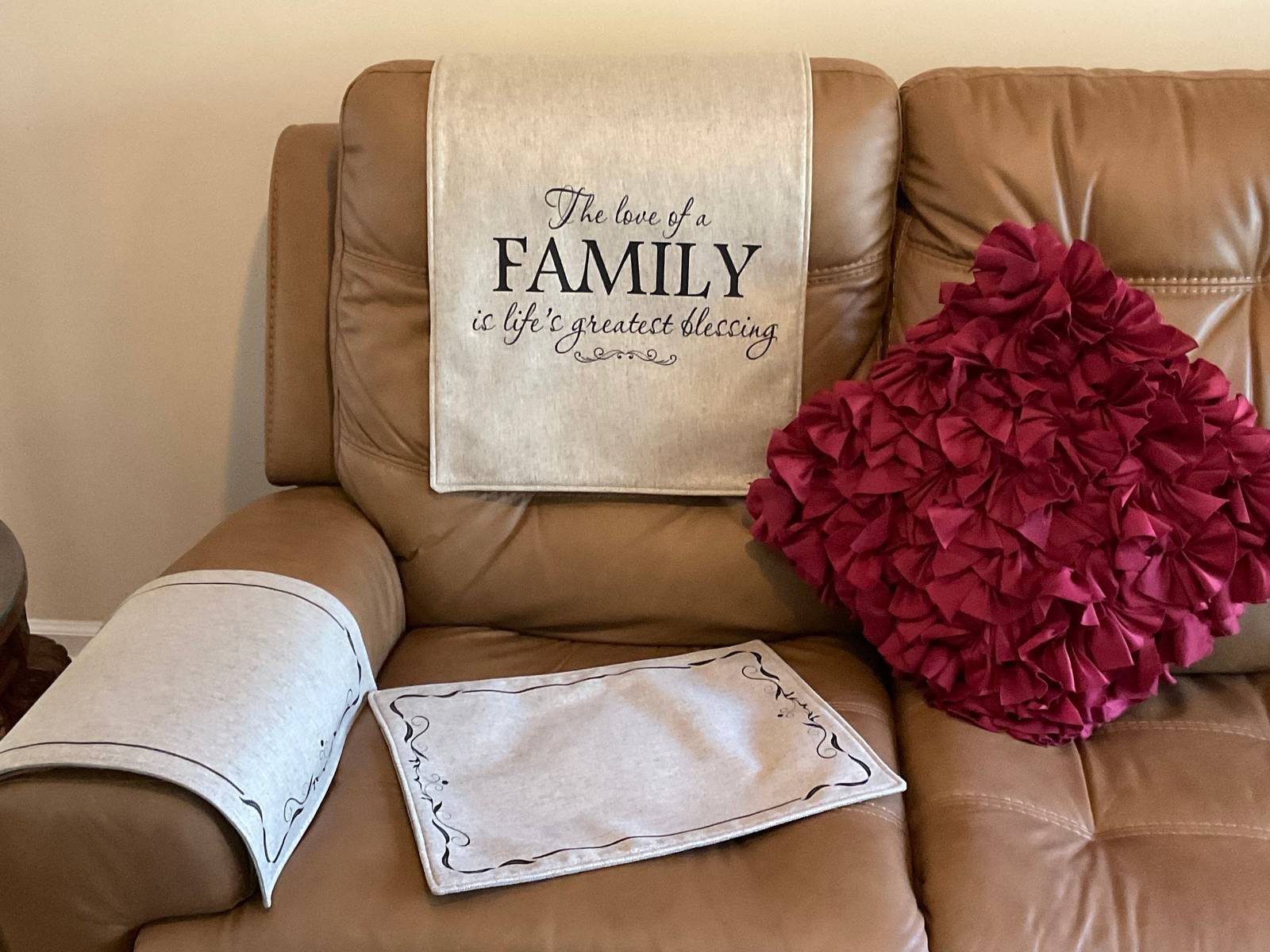3 PC. Set includes (1) Headrest and (2) Armrest covers. Professionally handmade here in USA. Top craftsmanship. Buy with confidence. Fast Free Shipping. Perfect to protect your furniture from stains while adding style to your room. Inspirational sayings ?Family? will add a touch of warmth to your home can be used in dining room, family room or any room you choose. Can be used on the reversible side for a solid color. Fits sofas, loveseats, recliners, office chairs, theater chairs and RV?s. The headrest comes with thumb nail head tacks to gently nail it to the back of your chair. Ships out the next day. * Our customer service is available for you 24/7. We make sure our customers are Top Priority. * We strive for Excellence and we appreciate your support in our business. Headrest: 17x27, Armrest: 14x18