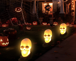 Complete Spooky Set: Get 3 detailed,3D horror skulls (11.3 inches) with ground stakes.Instantly create a frightening Halloween spectacle for your lawn. Eerie Glowing Effect: Each skull features a realistic, graveyard-worn design that glows in the dark, casting an creepy, attention-grabbing light for trick-or-treaters. Quick Simple Setup: Just push the stakes into the ground or a flower pot?no tools needed. Switch them on to emit a creepy glow (requires 3 AA batteries each, not included). Versatile Halloween Decor: Perfect for lining paths, gardens, or driveways. Ideal for enhancing Halloween parties and haunted houses to create a memorable scare. Instant Haunted Atmosphere: Transform any outdoor area into a chilling scene. The spooky light from these skulls delivers an unparalleled fright experience for all your guests.