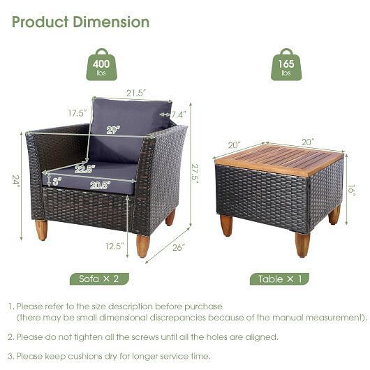 Specifications: Color ofCushion Black/Beige/Gray Material Acacia Wood Steel Rattan Sponge Fabric Single sofa dimensions 29" x 27" x 28.5"(L x W x H) Table dimensions 20" x 20" x 16"(L x W x H) Maximum weight of single sofa 400 lbs Maximum weight of table 165 lbs Net weight 54 lbs Box Qty 1(May vary by batch)