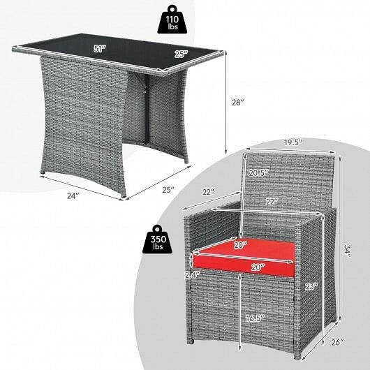 Specifications: Color of rattan: Mixed gray Color of cushion: Gray/Navy/Red/Turquoise/White Material: Steel PE rattan sponge tempered glass polyester fabric Dimension of table:41" x 25" x 28" (L x W x H) Dimension of each chair: 26" x 22" x 34" (L x W x H) Dimension of cushion: 20" x 20" x 2.4" (L x W x Thickness) Seat height from the ground: 16.5" Net weight of table: 26.5 lbs Net weight of each chair: 15 lbs Weight capacity of table: 110 lbs Weight capacity of each chair: 350 lbs Box Qty: 1(May vary by batch)Package includes: 1 x Table 2 x Chairs 2 x Cushions 1 x Instruction