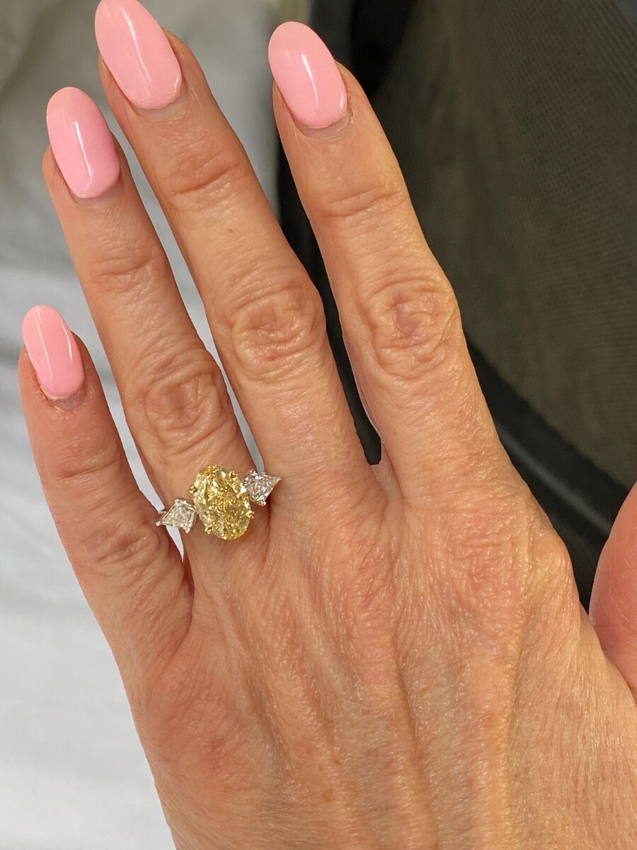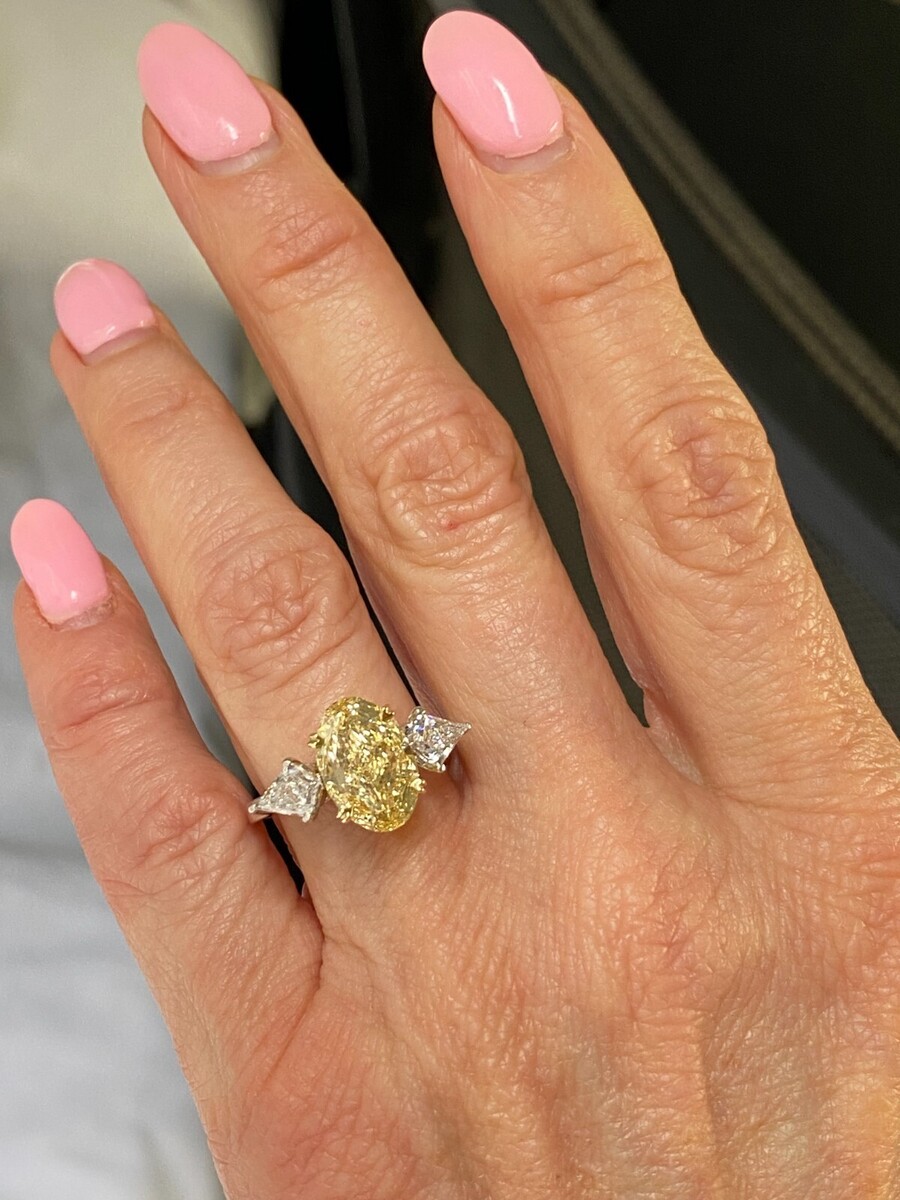 - 3 Stone 3Ct IGI Intense Yellow Oval Cut Lab Grown Diamond Ring 18K Gold 4.40Ctw