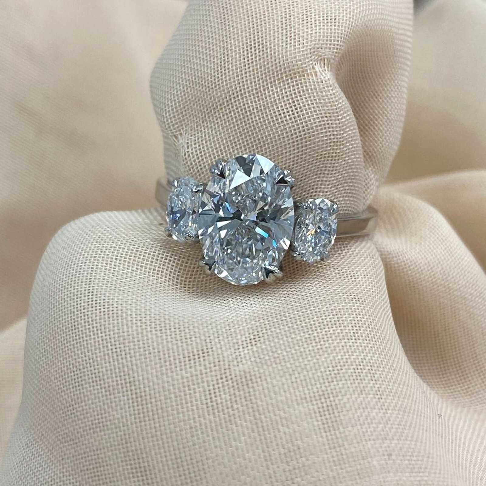 Crafted in 14k white gold, this ring showcases a captivating 2.16 carat IGI certified lab-grown oval brilliant cut diamond at its center, flanked by elegant oval brilliant cut lab grown diamonds on each side. The ring comes with International Gemological Institute Certificate (IGI) Number: LG661275398. The total carat weight is 2.72 carats.