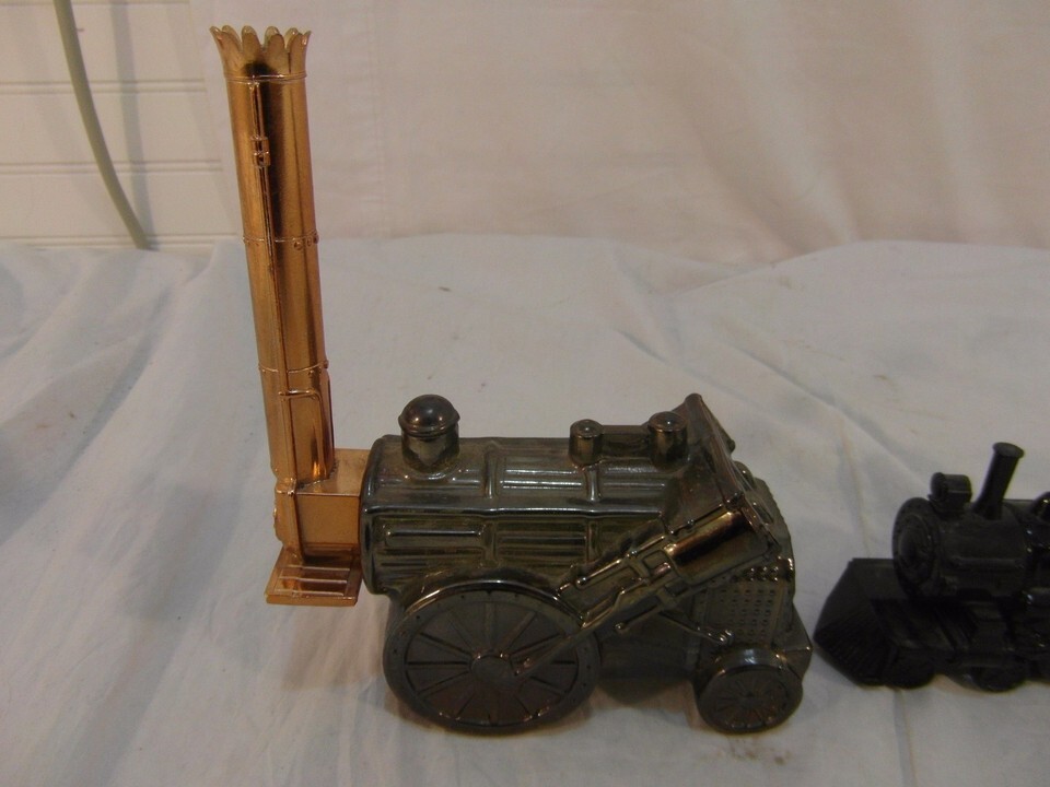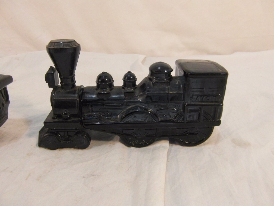 - 3 Vintage Avon Cologne Glass Train Bottles Gold, Dark Blue One Has Cologne 32889