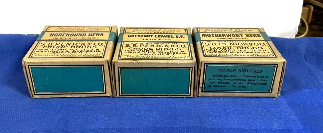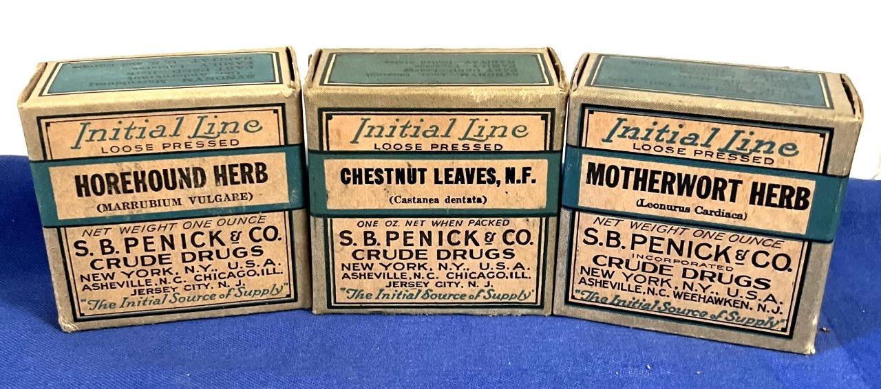 - 3 Vintage SB Penick & Co Horehound Motherwort Chestnut Leaves Herbs Sealed Box