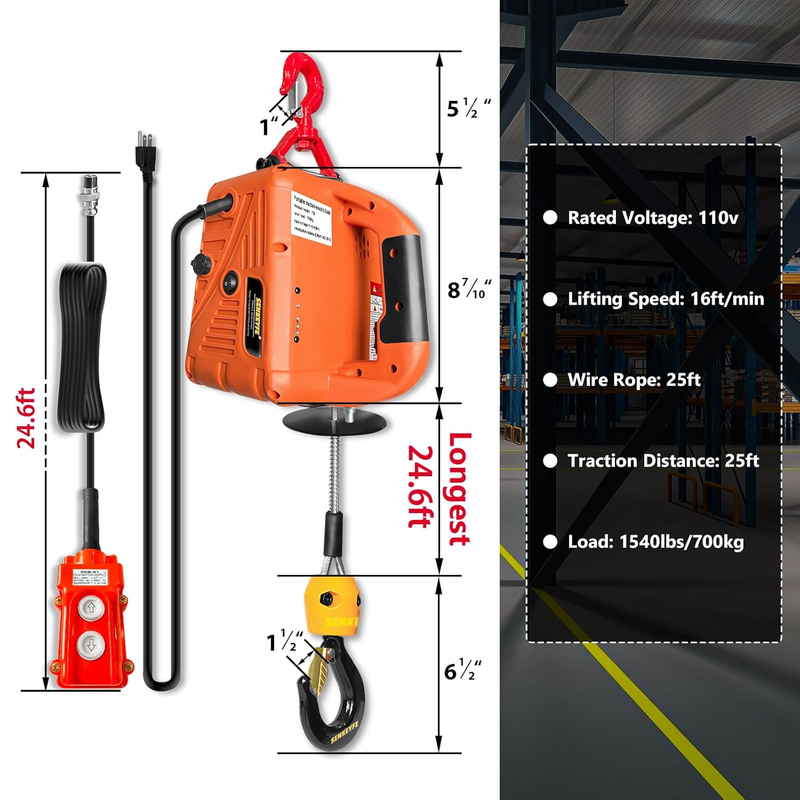 ?1500LBS RATED LOAD?:Designed with 1500 LBS lifting capacity, 1550 LBS Rated load; And eqquited with 1500W high power copper core motor, characterized by small size, high power, low heat production, low noise, stable performance, which providing a balance of strength saves time and increases productivity.