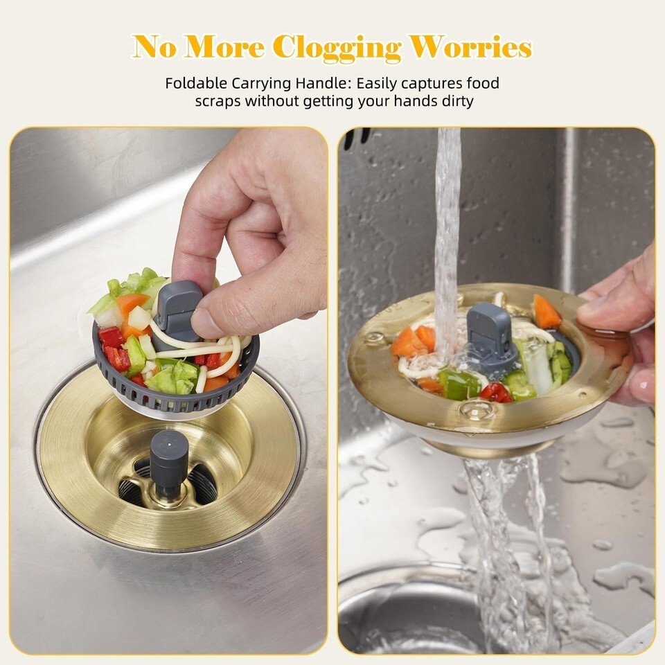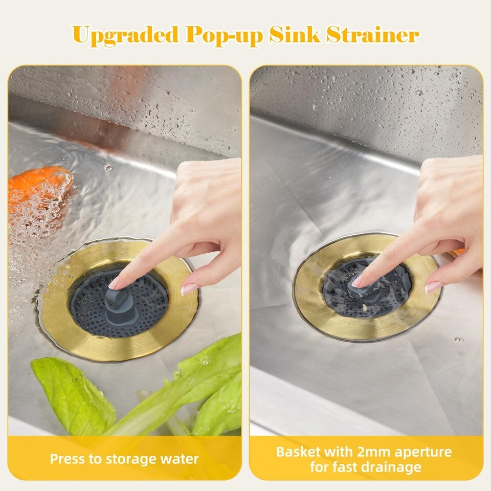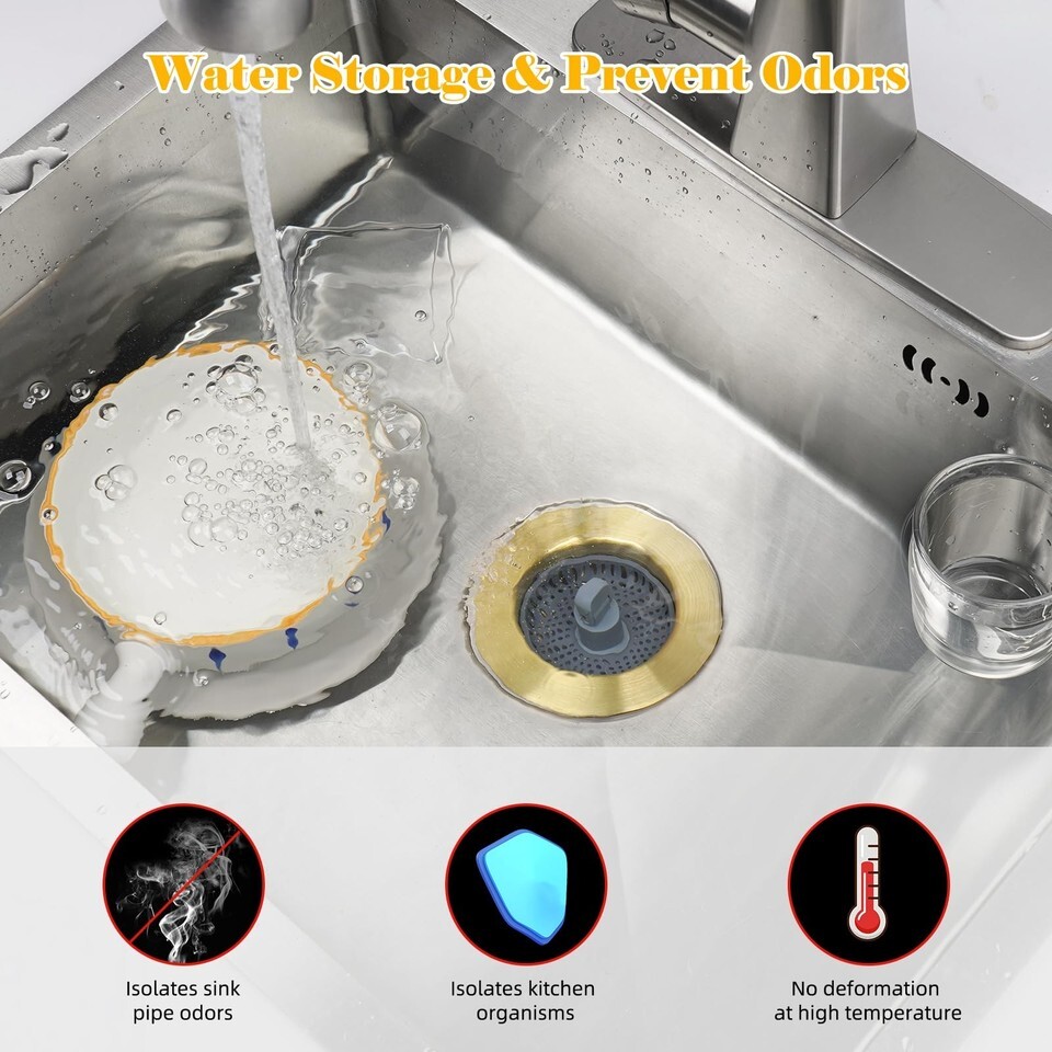 Upgraded three in one kitchen sink drain strainer: Our kitchen sink stopper integrates water storage, straining, and odor control. Equipped with multi-layer sealing gaskets, it securely stores water and eliminates kitchen drain odors