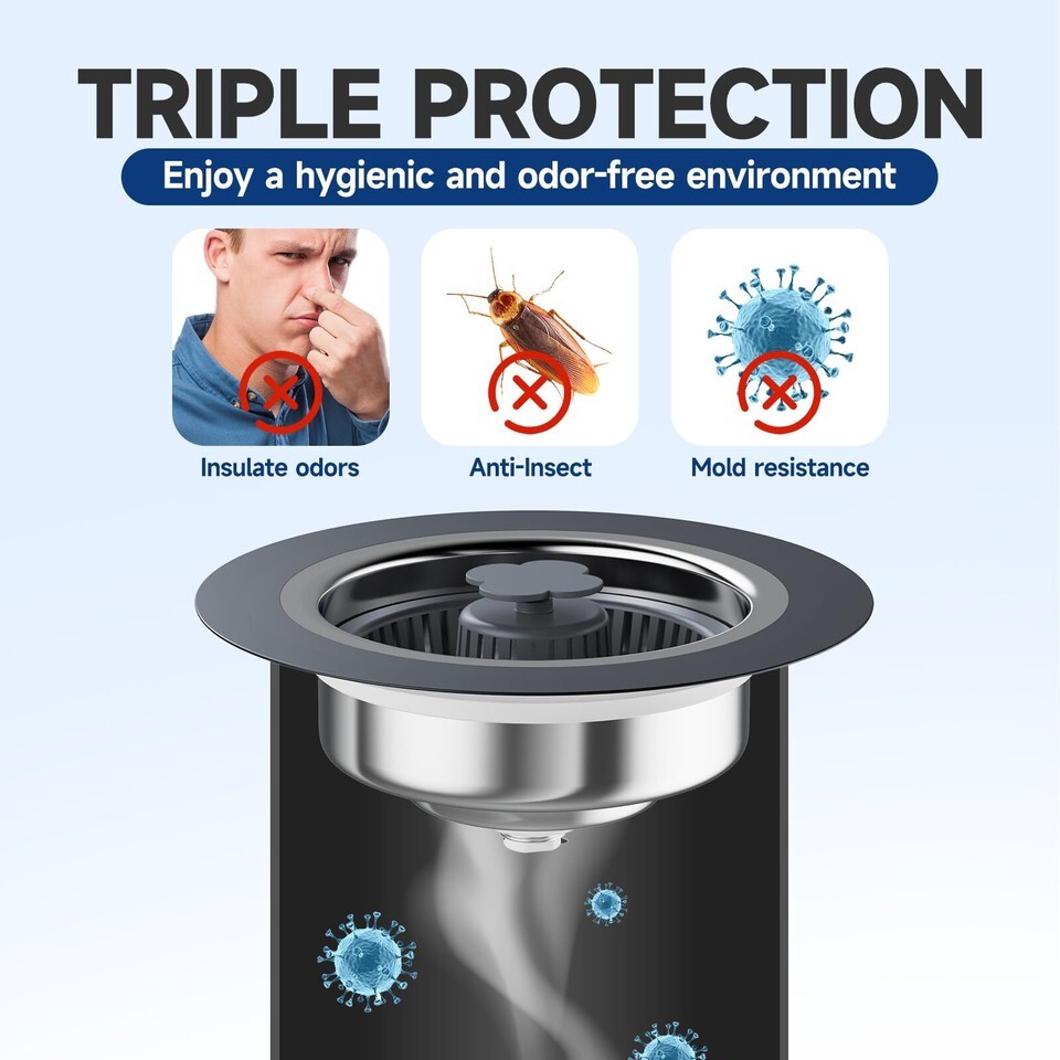 Triple Protection for a Cleaner Kitchen Say goodbye to unpleasant odors, pesky insects, and stubborn clogs with our Kitchen Sink Drain Strainer's triple protection. Enjoy a hygienic and odor-free environment as it effectively prevents odors, keeps insects at bay, and prevents clogs, ensuring a hassle-free kitchen experience.