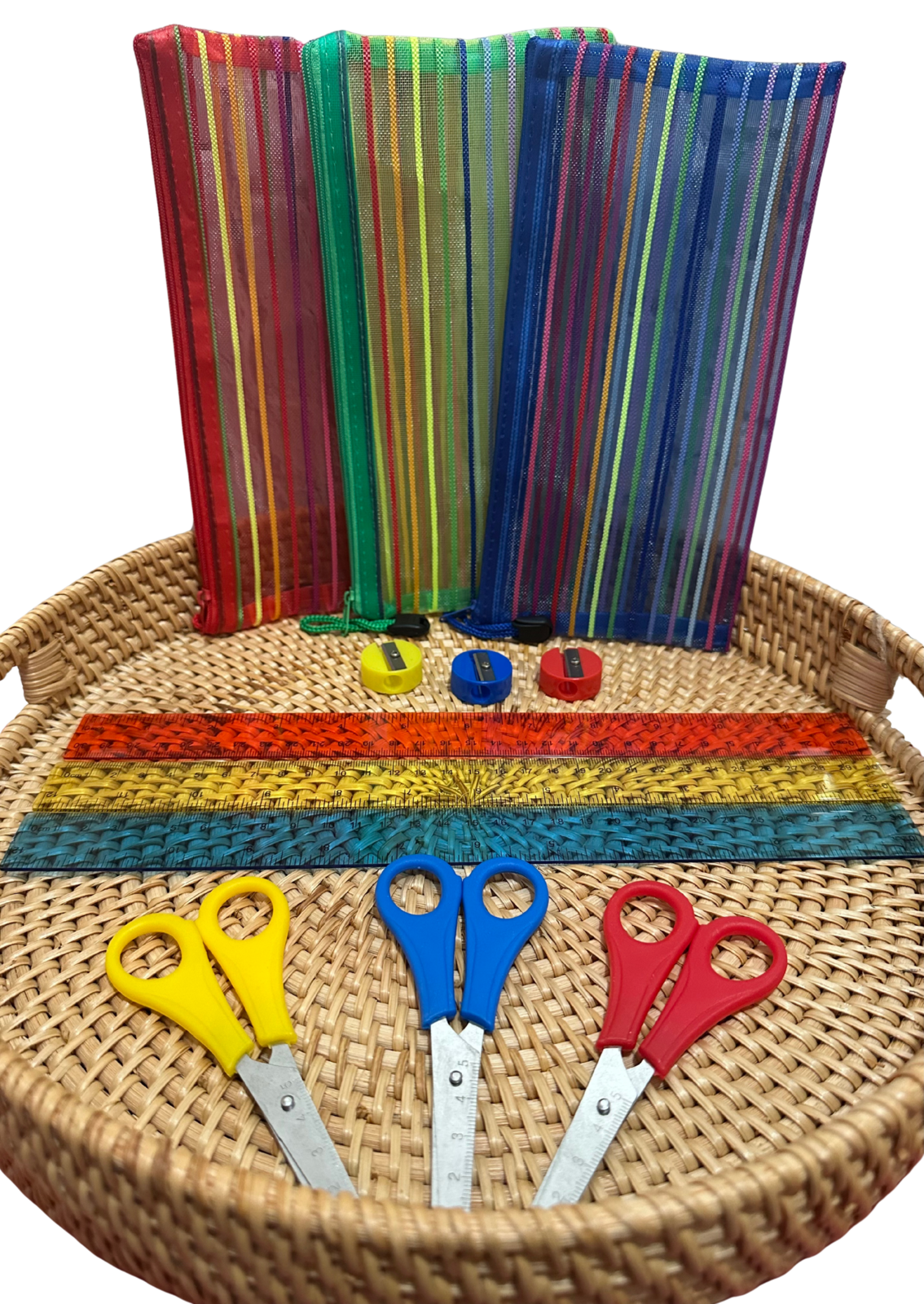 Make learning to cut safe and fun with this colorful 3-pack of children's safety scissor and pencil cass. Each pair features comfortable grip handles in vibrant yellow, red, and blue colors that help develop proper hand positioning and control. The built-in ruler edge along the blades adds educational value, allowing kids to measure while they cut. These scissors are specifically designed with rounded tips and safety-oriented cutting edges to protect young users while they develop their fine motor skills. Perfect for classroom activities, art projects, and home crafts, these scissors help children gain confidence in their cutting abilities. The durable construction ensures long-lasting use through multiple school terms and creative sessions. Ideal for early childhood education and suitable for both right and left-handed children, these scissors make cutting paper, cardstock, and other age-appropriate materials both safe and enjoyable.