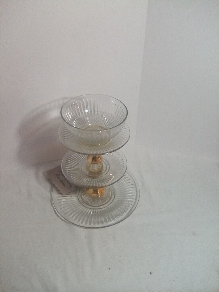 3 tiered glass serving dish 12" tall 10" bottom tray 7" second tray top tray and bowl 6". Goldleaf center spires.