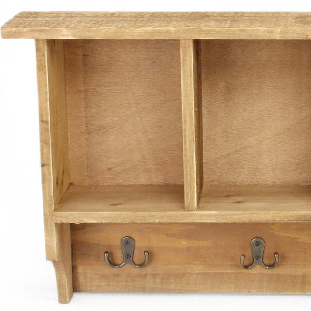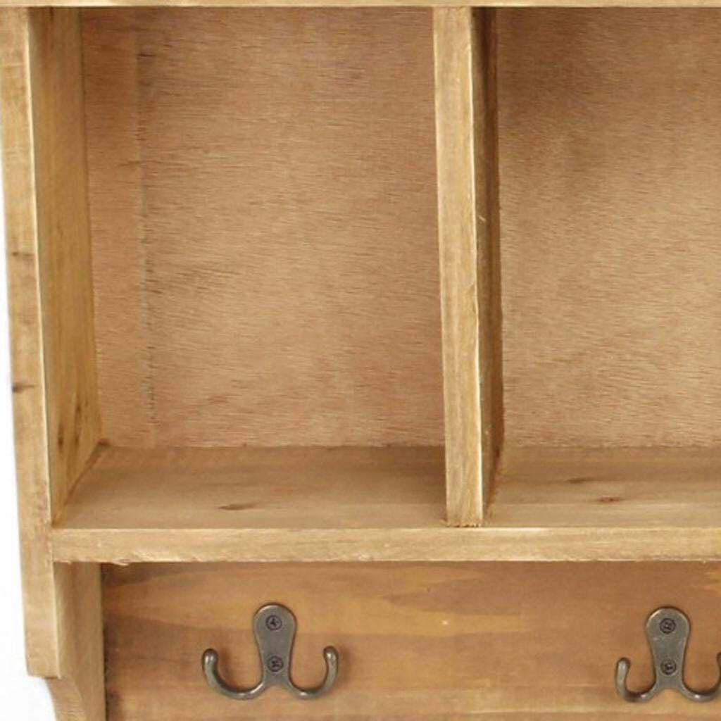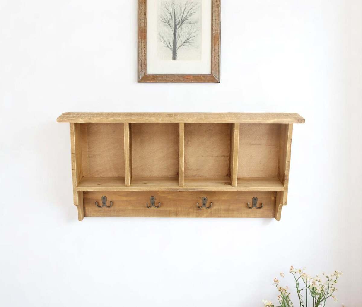 Key Features: Natural wood construction with a distressed finish for timeless appeal; four reliable hooks to handle daily essentials; integrated top shelf and cubbies for versatile storage.