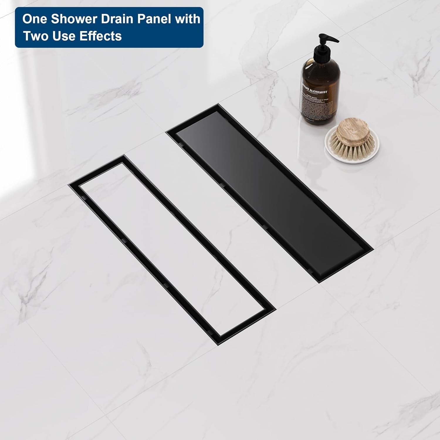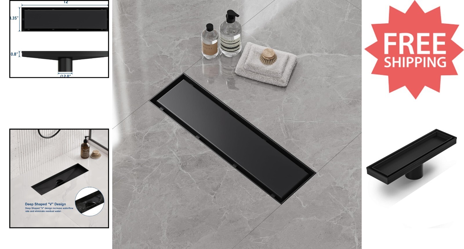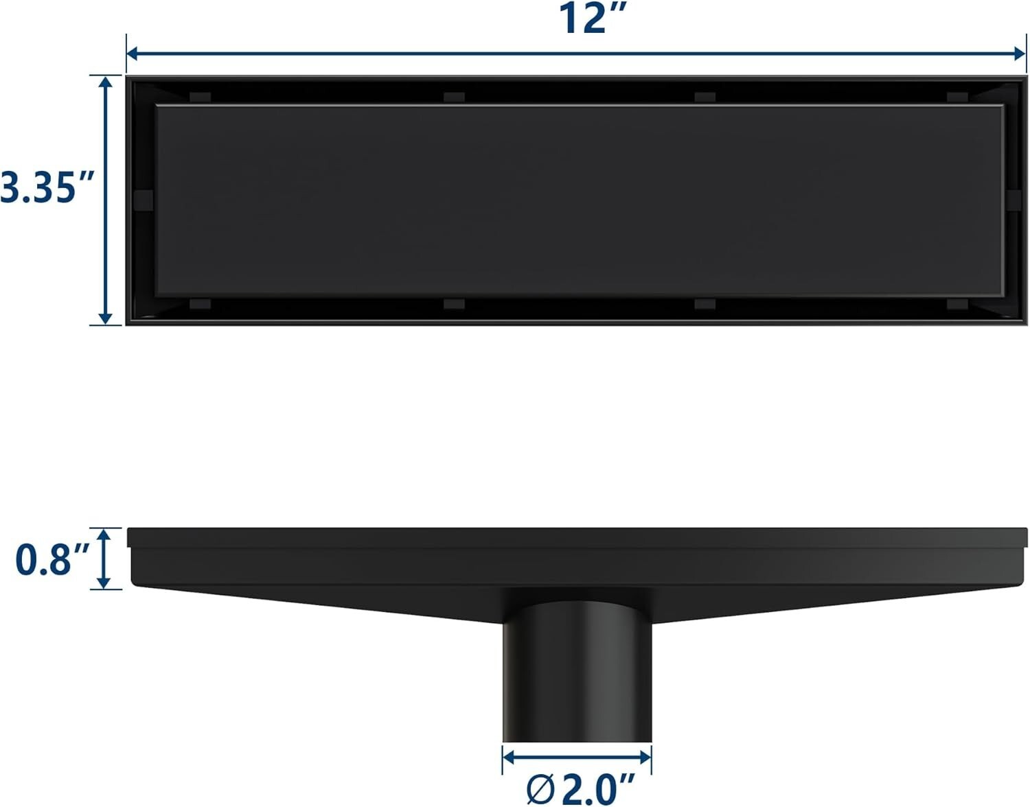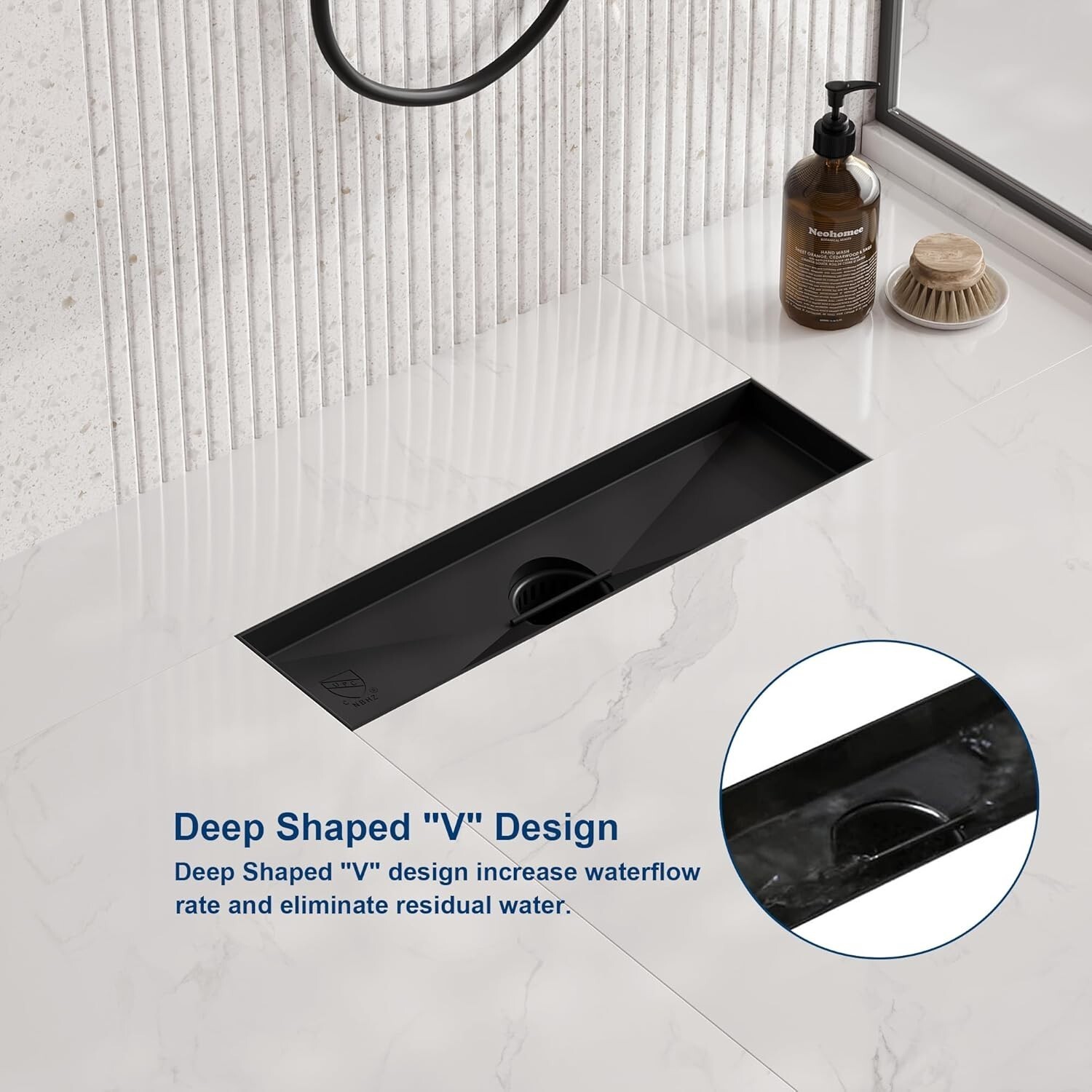 Discover the Neodrain 12" Linear Shower Drain, crafted from durable AISI 304 stainless steel with a sleek matte black finish resistant to corrosion and rust. Featuring a deep V slope design for efficient water flow and a high 35 L/min capacity, it effectively prevents water pooling and odors. The versatile 2-in-1 grate options include a modern flat or an elegant tile-in insert, seamlessly blending into your bathroom decor. Compatible with US No-Hub 2" shower drain bases (sold separately), this drain is ideal for bathrooms, kitchens, garages, and basements. Elevate your space with Neodrain's commitment to quality and style, transforming your daily routine into a luxurious experience.