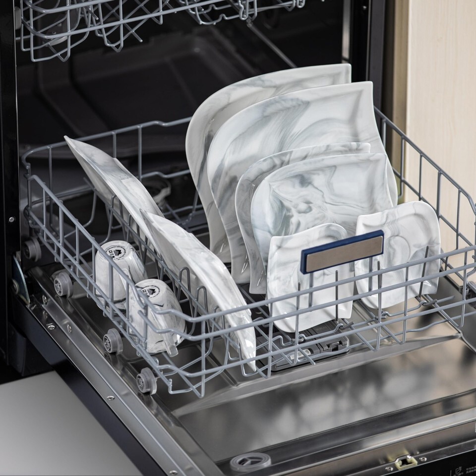 Diseño Exclusivo con Toque Natural ? Con su distintivo patron de marmol gris y forma en hoja, cada pieza ofrece un estilo único y contemporaneo que combina facilmente con cualquier vajilla existente.
