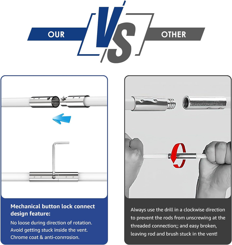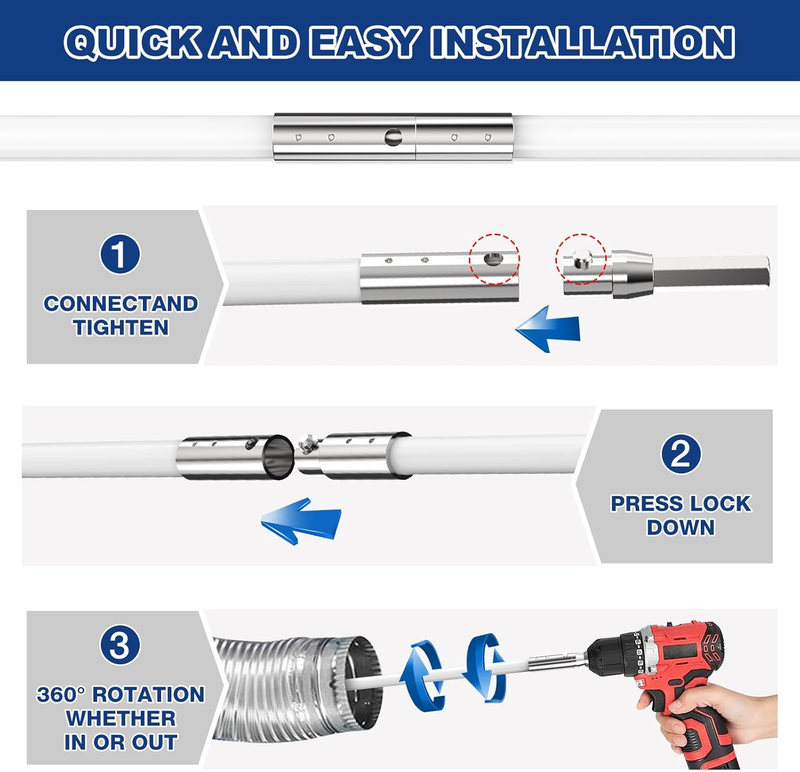 [Quick and Secure Installation]: Our improved quick snap rods make assembly a breeze, ensuring they stay connected whether you turn them clockwise or counterclockwise. Pair your cordless drill with the auger brush for comprehensive and hassle-free dryer vent cleaning.