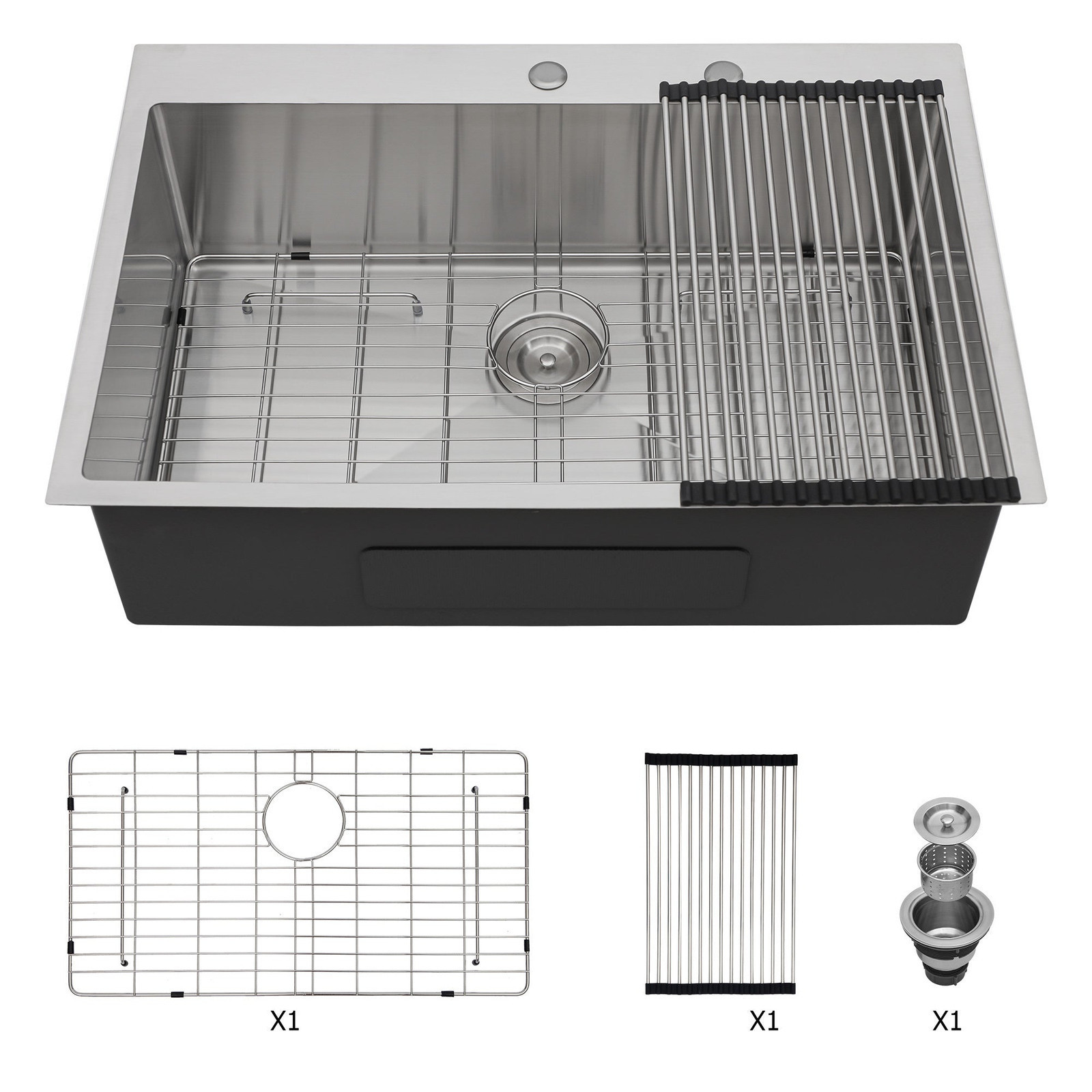 ? CUSTOMIZED PREMIUM ACCESSORIES? Comes with this kitchen sink: 1x304 stainless steel dish grid, 1 x drain assembly, 1 x drying rack,1 x pack clips, 1 x cutout template and installation instruction. R10 Round corner is designed to prevent corner rust and super easy in maintaining and cleaning.