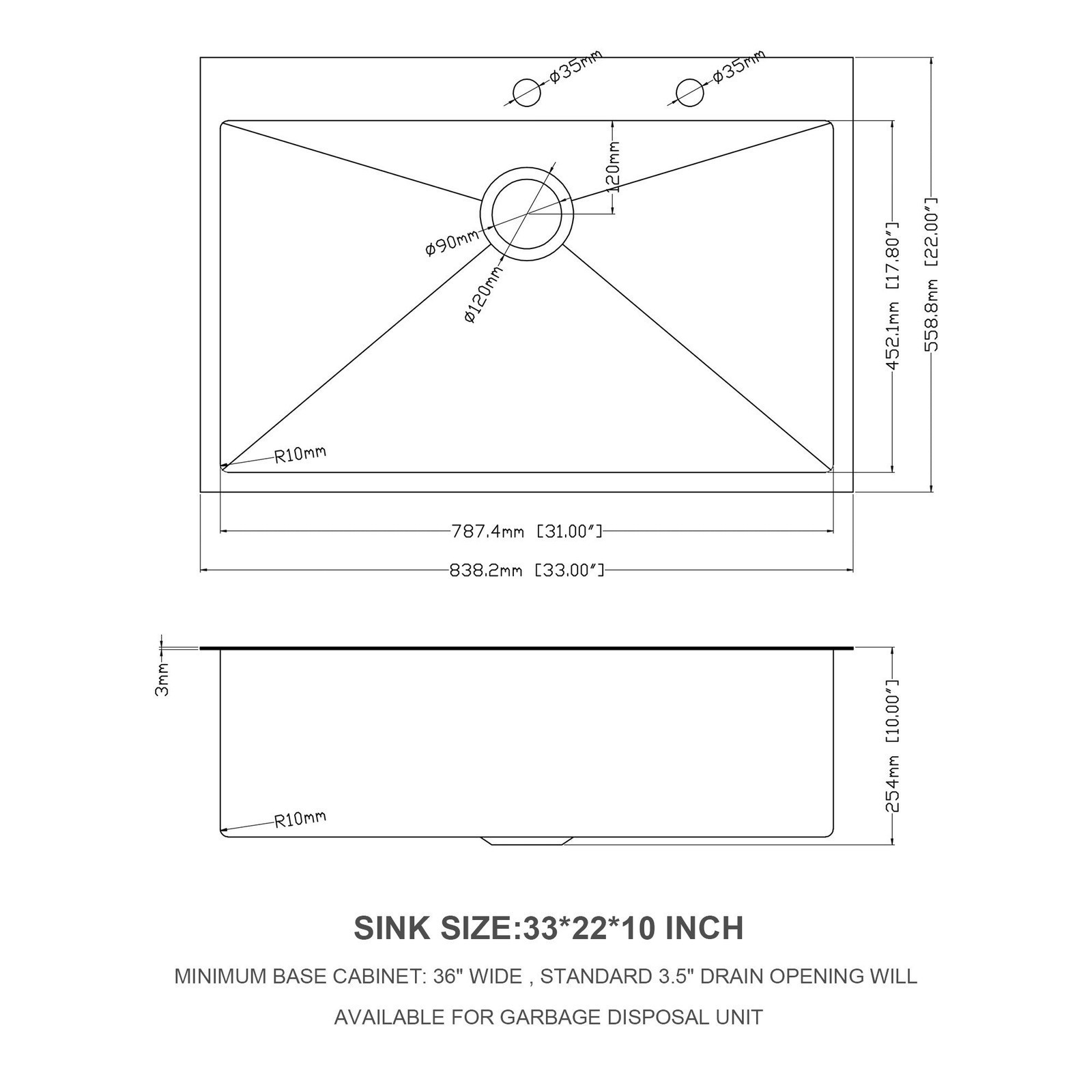 ?Big, Deep Topmount Kitchen Sink ?- 33*22*10 inch(minimum cabinet size is 36 inch); designed with two standard 35mm pre-drilled faucet holes (decorative caps included) . Standard 3.5' drain openings will fit any garbage disposal unit.