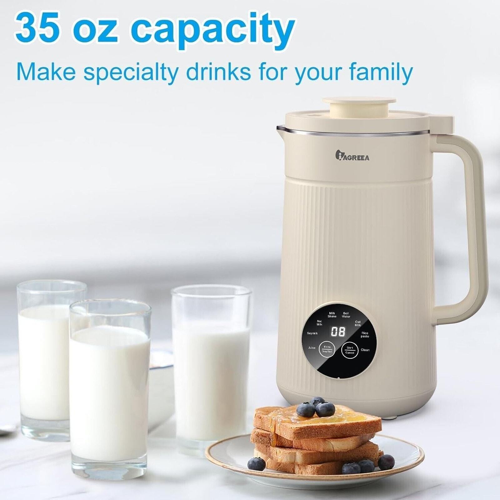 * 35oz Large Capacity -- Makes 35oz of beverage to have fresh milk once! Plus make a variety of hot cold plant-based beverages, including juice, smoothies, shakes, and more!