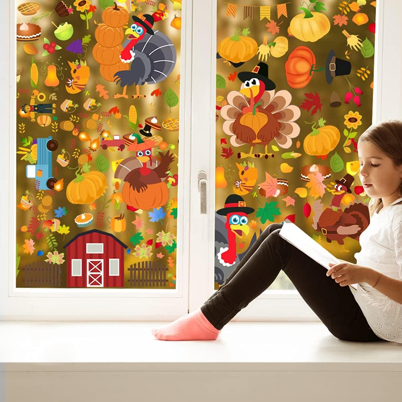 Value Package: 6 Sheet Autumn Fall Window Clings, each measures 14?? x 10??. Total at 350Pcs to meet your needs for Thanksgiving window decorations.