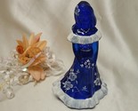 Up for your consideration is a stunning 7" Fenton Bridesmaid Doll Figurine made in a brilliant cobalt blue color with snow white ruffled top and skirt bottom. She has a lovely handpainted floral pattern that surrounds her dress with a lovely snow white sash. Her mould number is No.5228 (ES) and has her silver and black Fenton label in place. She is artist signed by Artist D. Robinson as Fenton Collectibles. She was made in Circa 2012. Sorry no box