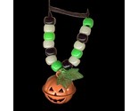 Cute Round 3D JACK-O-LANTERN SMILE FACE JINGLE BELL Funky Pendant Necklace - Fall Autumn Holiday Pumpkin Charm Halloween Costume Novelty Jewelry - Colorful ORANGE enameled metal hollow 3-D HAPPY FACE Fully Dimensional charm, each approx. 1-inch (2.5cm) Diameter, with Plastic Green Leaves detail, on your choice of 24-inch or 30-inch Black Satin Neck Cord with a colorful combination of glow and opaque acrylic beads. Really Jingles while you walk!