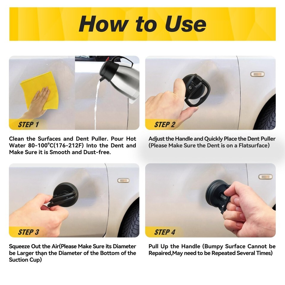 Tips for Use: Before using dent remover tool for car, please ensure that: 1. Dent puller kit is firmly attached to the surface of the dent. 2.The car dent is located on a clean, smooth, flat, non-porous, and dry surface. 3. The car dent exceeds the diameter of the bottom of the car dent remover. 4. The product is not used in areas where the car paint is already damaged within the depressed region