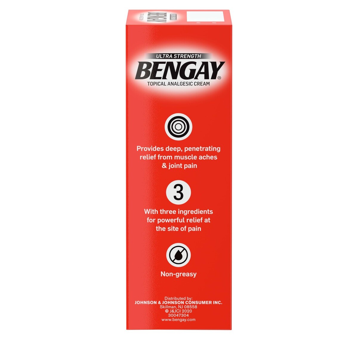 3 Tubes Expiration Date of 04/2026 ? 2-ounce tube of non-greasy Bengay Ultra Strength Topical Pain Relief Cream with three powerful ingredients to ease backaches, minor arthritis, muscle, and joint pain ? Topical analgesic cream provides penetrating relief from muscle aches and joint pain. It contains three pain-relieving ingredients for powerful relief at the site of pain: 4% camphor, 10% menthol, and 30% methyl salicylate ? Pain relief cream provides temporary relief from minor aches and pains of muscles and joints associated with simple backaches, minor arthritis pains, strains, bruises, and muscle sprains ? Bengay, a physician-recommended OTC topical analgesic brand, contains more pain-relieving ingredients than any other Bengay product. Adults and children 12 years and older, apply to the affected area no more than three to four times daily ? Pack the topical pain relief analgesic in a convenient tube in your gym bag or suitcase for port-able on-the-go relief from aches, minor arthritis, joint, and back pain