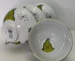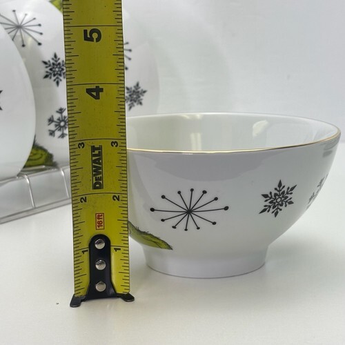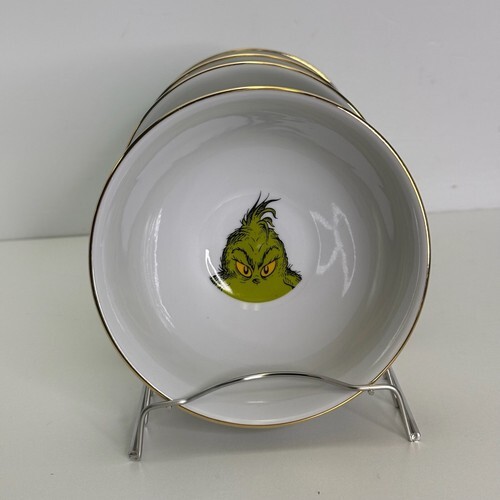 This four-piece bowl set features a round shape with a Grinch character design, perfect for Christmas occasions. The bowls are made of ceramic with a shiny finish and a gold rim, each measuring 5.5 inches in diameter. The design showcases the Grinch face and snowflakes, adding a festive touch to your dining experience. Manufactured in 2024 by Grinch Enterprises, these original bowls are part of "The Grinch Who Stole Christmas" theme, making them a unique addition to your dinnerware collection.
